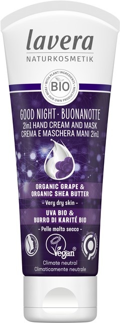De Good Night 2in1 Hand Cream and Mask van Lavera is een handcrème en handmasker voor zijdezachte handen. Biedt directe verlichting voor ruwe handen, verlicht het gevoel van een strakke, trekkerige huid en zorgt voor onmiddellijke, langdurige bescherming. De regenererende formule biedt bijzonder intensieve verzorging voor je handen terwijl je slaapt - voor een mooie, zijdezacht gevoel in de morgen. Abessijnse olie beschermt, voedt, hydrateert en zorgt voor een gladdere, stralende huid. Biologisch druivenpitextract stimuleert de celvernieuwing en collageensynthese voor een stevigere, gezonde huid. Natuurlijke vitamine E ondersteunt de regeneratie van de huidbarrière. Bevat verder o.a. biologische shea butter, biologische cacaoboter en biologische aloë vera. De Good Night 2in1 Hand Cream and Mask is speciaal geschikt voor de zeer droge huid.