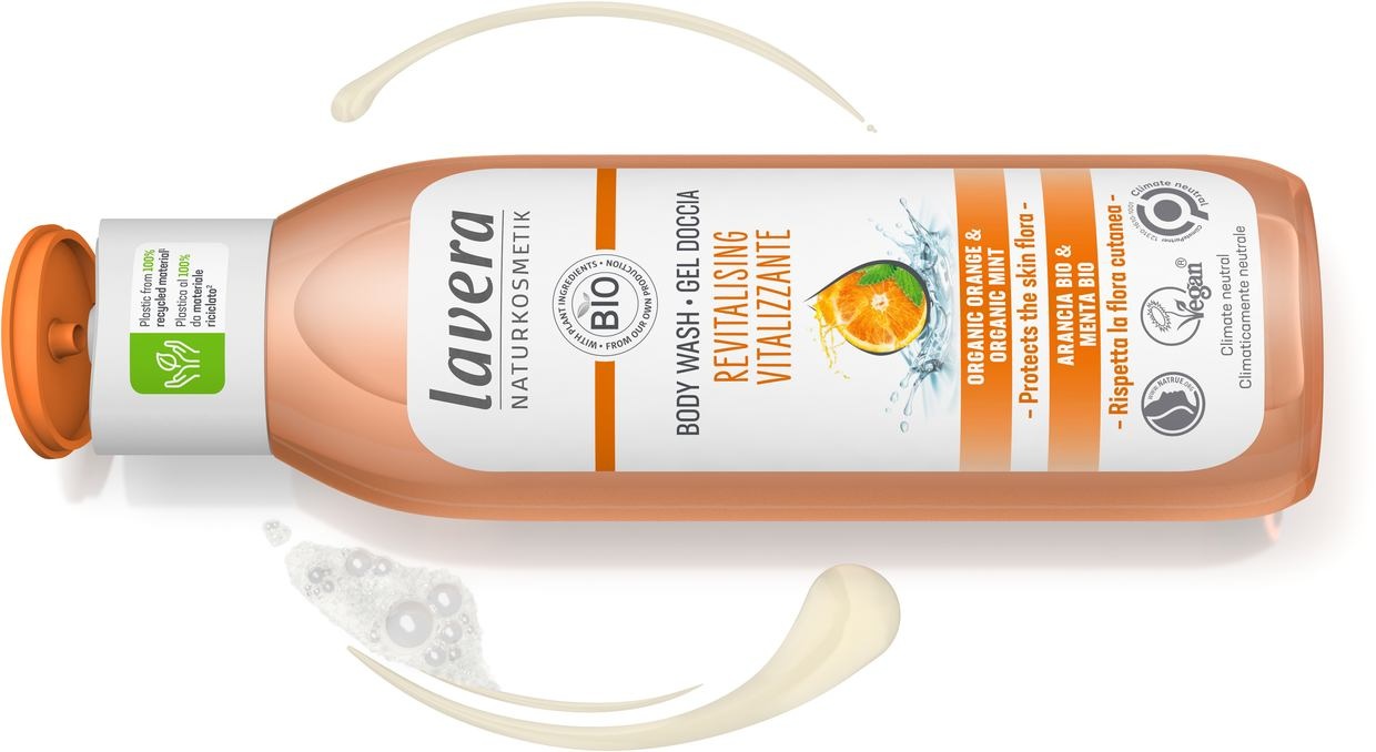 De Revitalising Body Wash van Lavera zorgt voor een revitaliserende douche-ervaring. De pH-gebalanceerde formule met milde tensiden zorgt voor een zachte reiniging van de huid, terwijl het de natuurlijke huidflora beschermt. Biologische sinaasappel, met zijn stimulerende geur, revitaliseert de zintuigen en staat bekend om zijn uitstekende huidverzorgende eigenschappen. Biologische pepermunt revitaliseert de vermoeide huid met zijn verfrissende effect. De frisse en zonnige geur van sinaasappel zorgt voor een weldadige, revitaliserende ervaring. De Revitalising Body Wash is ook geschikt voor voor de droge en gevoelige huid.