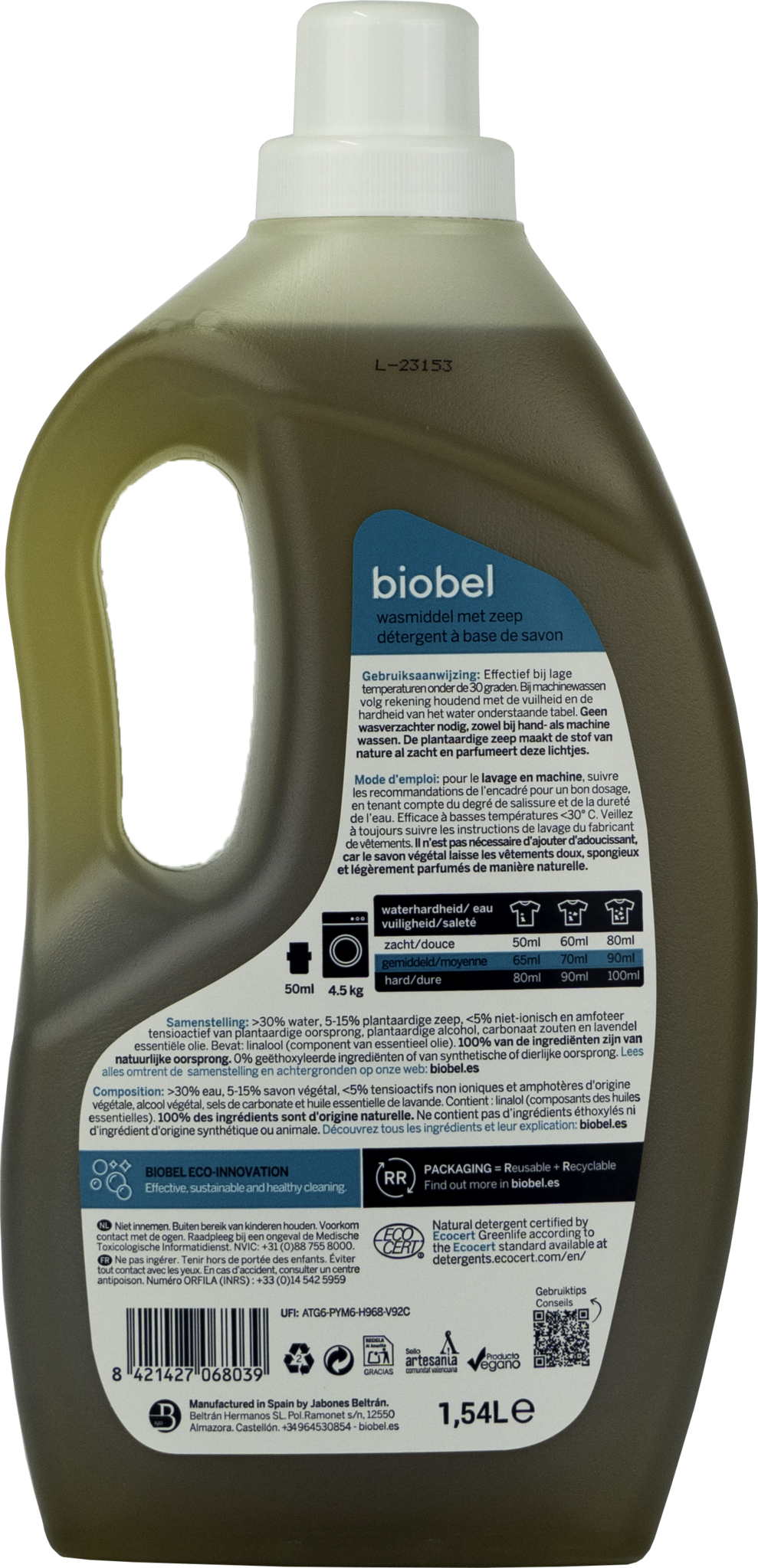 Natuurlijk wasmiddel gecertificeerd door ECOCERT Greenlife volgens de ECOCERT-norm, te raadplegen op http://detergents.ecocert.com/en/.