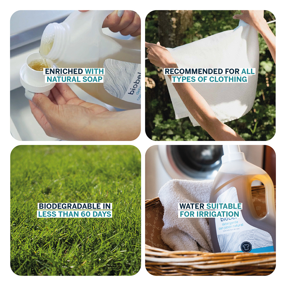 Ons vloeibaar wasmiddel, verrijkt met natuurlijke zeep, verzacht en verzorgt uw kleding, waardoor deze langer meegaat.
