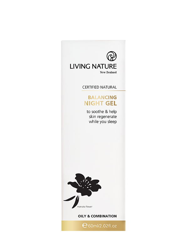 De Balancing Night Gel van Living Nature is een verzachtende, herstellende gel die de huid helpt regenereren tijdens de slaap. De hoge concentratie manuka honing voedt, hydrateert, herstelt en stimuleert de celvernieuwing. Jojoba olie, squalaan en tarwekiemolie hydrateren en zorgen voor een soepele, zachte huid. Antibacterieel manuka extract zuivert en bisabolol brengt de huid tot rust. Harakeke vlasgel verzacht en stimuleert het huidherstel. Gemberwortelextract zorgt voor een heldere huid. Bevat verder o.a. teunisbloemolie, grapefruitextract en olijfextract. De Balancing Night Gel is speciaal ontwikkeld voor de vette en onzuivere huid.