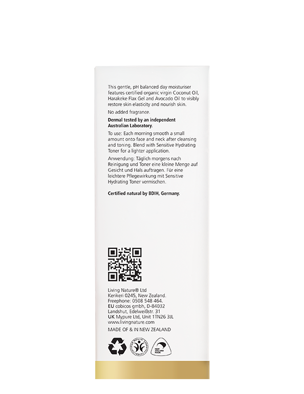 De Sensitive Day Moisture van Living Nature is een gecertificeerd natuurlijke dagcrème die de huid effectieve, voedende verzorging biedt zonder irritatie. Geformuleerd om de natuurlijke huidbarrière te versterken, de elasticiteit te herstellen en tekenen van veroudering en vochtverlies te verminderen. Biologische virgin kokosolie hydrateert, bevordert het huidherstel en werkt antimicrobieel. Avocado olie voedt intensief, beschermt, kalmeert en vermindert tekenen van huidveroudering. Harakeke vlasgel hydrateert, verzacht en stimuleert het huidherstel. Grapefruit extract is rijk aan vitamine C en zorgt voor een zuivere, heldere huid. De Sensitive Day Moisture is vrij van etherische oliën en alcohol en speciaal geschikt voor de (zeer) gevoelige en droge huid.