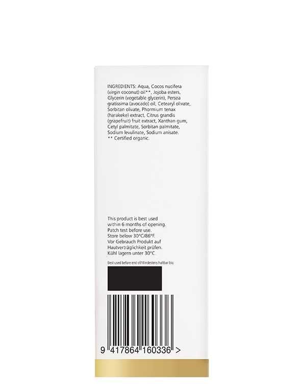 Aqua, Cocos nucifera (virgin coconut) oil**, Jojoba esters, Glycerin (vegetable glycerin)**, Persea gratissima (avocado) oil, Cetearyl olivate, Sorbitan olivate, Phormium tenax leaf juice (NZ flax gel), Citrus grandis (grapefruit) fruit extract, Xanthan gum, Cetyl palmitate, Sorbitan palmitate, Sodium levulinate, Sodium anisate.