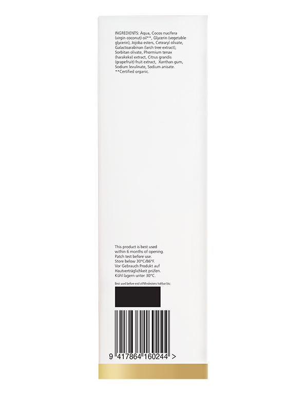 Aqua, Cocos nucifera (virgin coconut) oil**, Glycerin (vegetable glycerin)**, Jojoba esters, Cetearyl olivate, Galactoarabinan (larch tree extract), Sorbitan olivate, Phormium tenax leaf juice (NZ flax gel), Citrus grandis (grapefruit) fruit extract, Xanthan gum, Sodium levulinate, Sodium anisate.