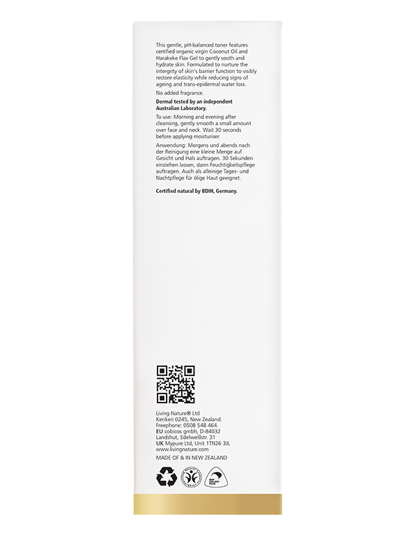 De Sensitive Hydrating Toner van Living Nature biedt verzachtende hydratatie en zachte, effectieve tonificatie zonder irritatie. Geformuleerd om de huideigen barrièrefunctie te versterken en tekenen van huidveroudering en droogte te verminderen. Biologische virgin kokosolie voedt, bevordert het huidherstel en werkt antimicrobieel. Extract van Lariksschors en Harakeke vlas gel hydrateren intensief, verzachten en stimuleren de huidregeneratie. Grapefruitextract is rijk aan vitamine C en zorgt voor een heldere, zuivere huid. De Sensitive Hydrating Toner is vrij van etherische oliën en alcohol en speciaal geschikt voor de (zeer) gevoelige en droge huid.