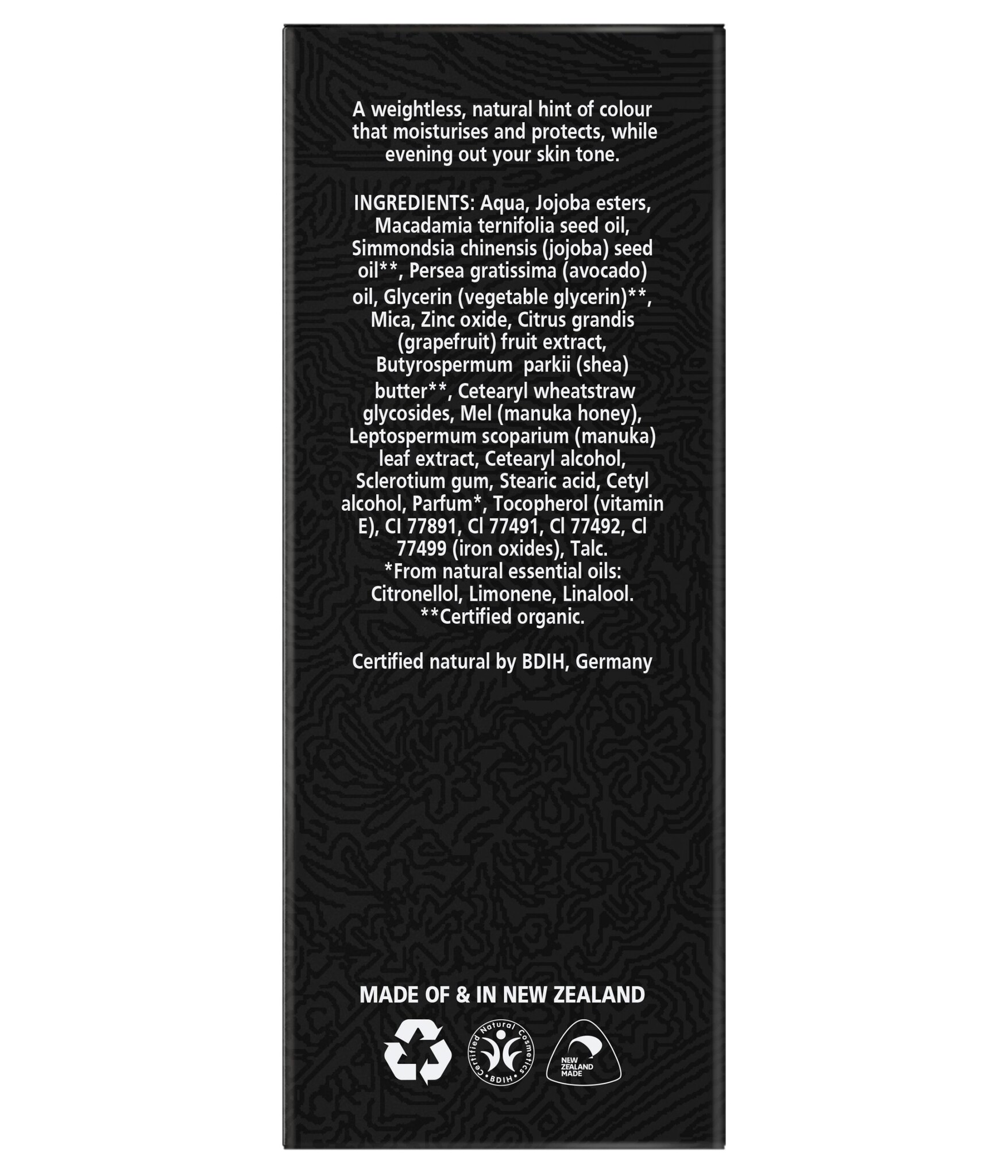 Aqua (water), Jojoba esters, Macadamia ternifolia seed oil, Simmondsia chinensis (jojoba) seed oil**, Persea gratissima (avocado), Glycerin (vegetable glycerin)**, Mica, Zinc oxide, Citrus grandis (grapefruit) fruit extract, Butyrospermum parkii (shea) butter**, Cetearyl wheatstraw glycosides, Mel (manuka honey), Leptospermum scoparium (manuka) extract, Cetearyl alcohol, Sclerotium gum, Stearic acid, Cetyl alcohol, Pelargonium graveolens (geranium) oil*, Tocopherol (vitamin E), Melaleuca alternifolia (tea tree) oil, CI 77891 (titanium dioxide), Cl 77491, Cl 77492, Cl 77499 (iron oxides), Talc.