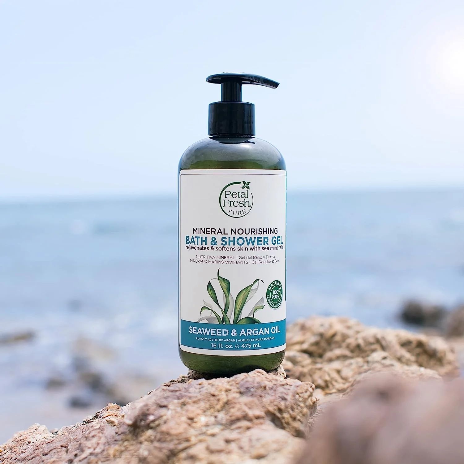 Petal Fresh® Pure Bath & Shower Gel Seaweed & Argan Oil voedt de huid met zeemineralen. Gecertificeerde biologische zeewier bevat veel verzachtende mineralen, terwijl gecertificeerde biologische arganolie een diepe hydratatie levert voor een gevoede huid lang na het douchen.