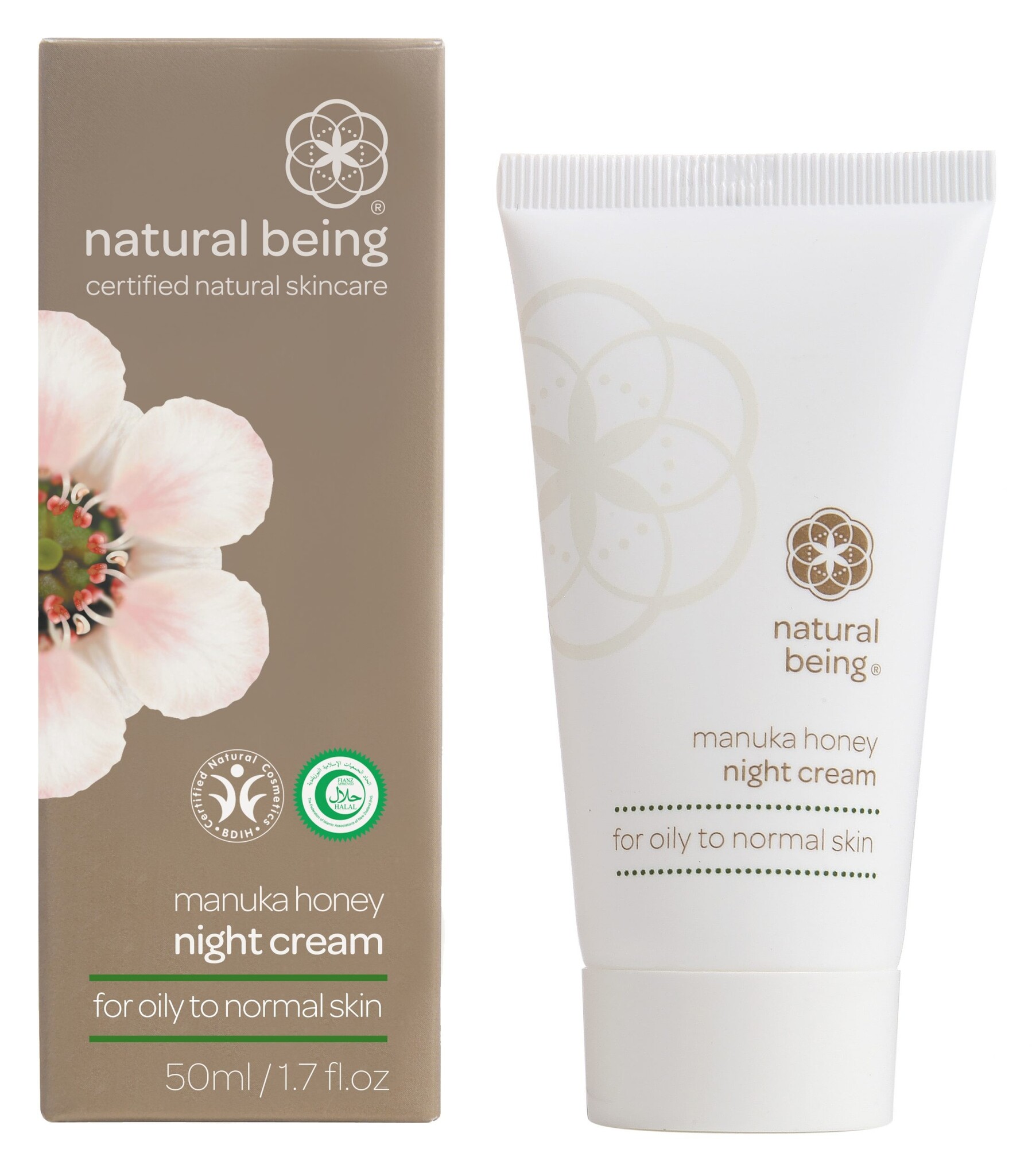 De Manuka Night Cream Normal/Oily Skin van Natural Being is een lichte, niet-vette nachtcrème die de huid gedurende de nacht weer in evenwicht brengt. Jojoba olie en squalaan hydrateren de huid intensief, verbeteren de huidelasticiteit en brengen de huid in balans. Grapefruit extract is rijk aan vitamine C en werkt verhelderend en zuiverend. Actieve manuka honing stimuleert de huidregeneratie en werkt verzachtend en voedend. Manuka olie werkt antimicrobieel en bestrijdt de micro-organismen die irritatie en acne veroorzaken. Bevat verder o.a. wortelolie, Totarol en calendula extract. De Manuka Night Cream Normal/Oily Skin heeft een lichte, eenvoudige formule en is ideaal voor de normale tot vette tienerhuid.