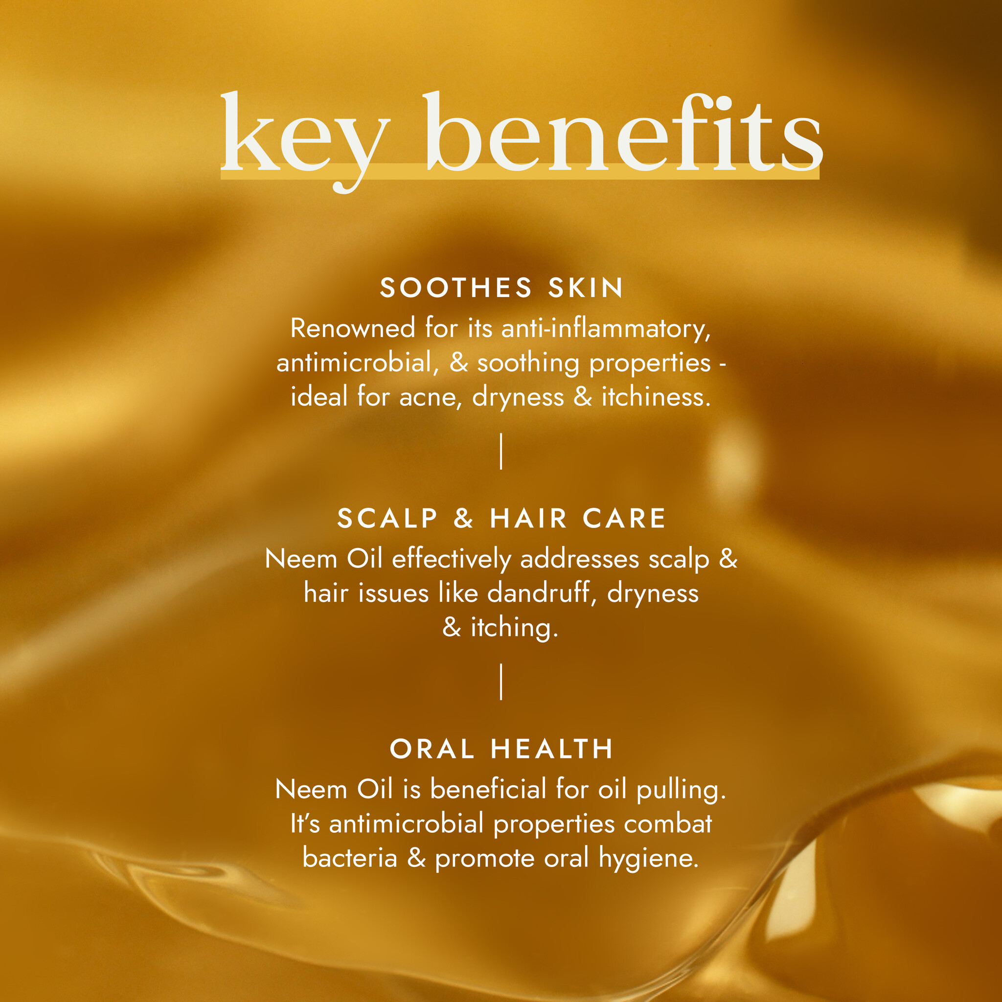 Neemolie is rijk aan nuttige essentiële vetzuren en vitamine E, en bevat aanzienlijke hoeveelheden oliezuur, linolzuur, palmitinezuur en stearinezuur om te kalmeren en aan te vullen. Het helpt de huid soepel en glad te houden en laat geen vettig residu achter, en de verbindingen zoeken naar schadelijke vrije radicalen om veroudering tegen te gaan. Neem olie, die het beste vlak voor het slapengaan wordt aangebracht, is zeer herstellend en kan littekens, rimpels, acne en eczeem helpen verminderen.