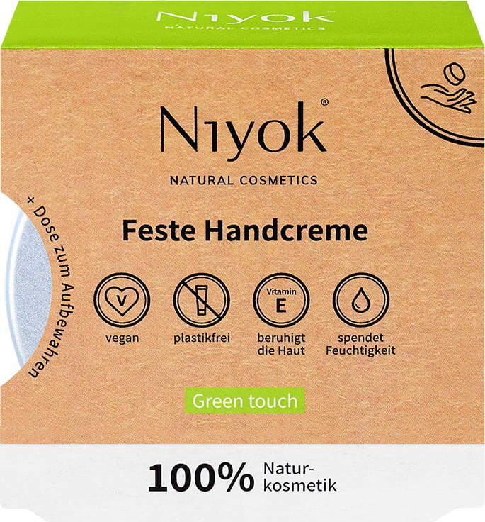 De Vaste Handcrème Green Touch van Niyok is een plasticvrije, natuurlijke handcrème die je huid langdurig van vocht voorziet. Voor soepele, zachte handen met een heerlijke geur van kardemom en mimosa. Vitamine E en lipiden hebben een kalmerende en verzorgende werking. Bevat verder o.a. sheabutter, kokosolie en cupuaçuboter. De Vaste Handcrème Green Touch is vegan en vrij van microplastics en palmolie. Verpakt in plasticvrij karton. Met één vaste handcrème kun je wel twee plastic tubes van 75ml besparen.