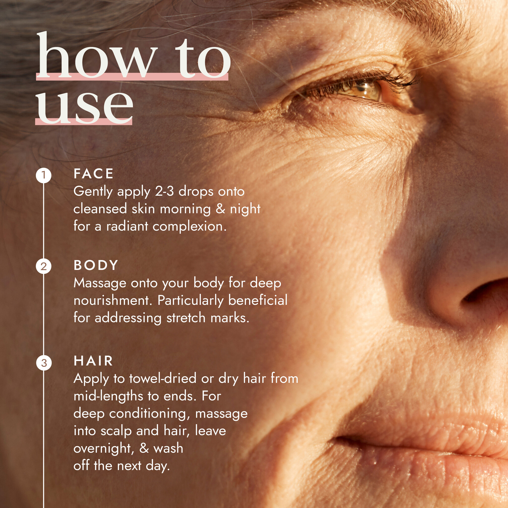 Gebruik: Je kunt een paar druppels olie op elk deel van het lichaam aanbrengen en zachtjes in cirkelvormige bewegingen masseren totdat het wordt opgenomen. De werking van een bodyolie is het beste als je deze aanbrengt op nog vochtige huid na het douchen. Je poriën staan dan van de warmte nog een beetje open waardoor de bodyolie goed in de huid opgenomen kan worden. Ook is door de warmte de bloedsomloop gestimuleerd wat ervoor zorgt dat de werkstoffen uit de bodyolie beter worden opgenomen.