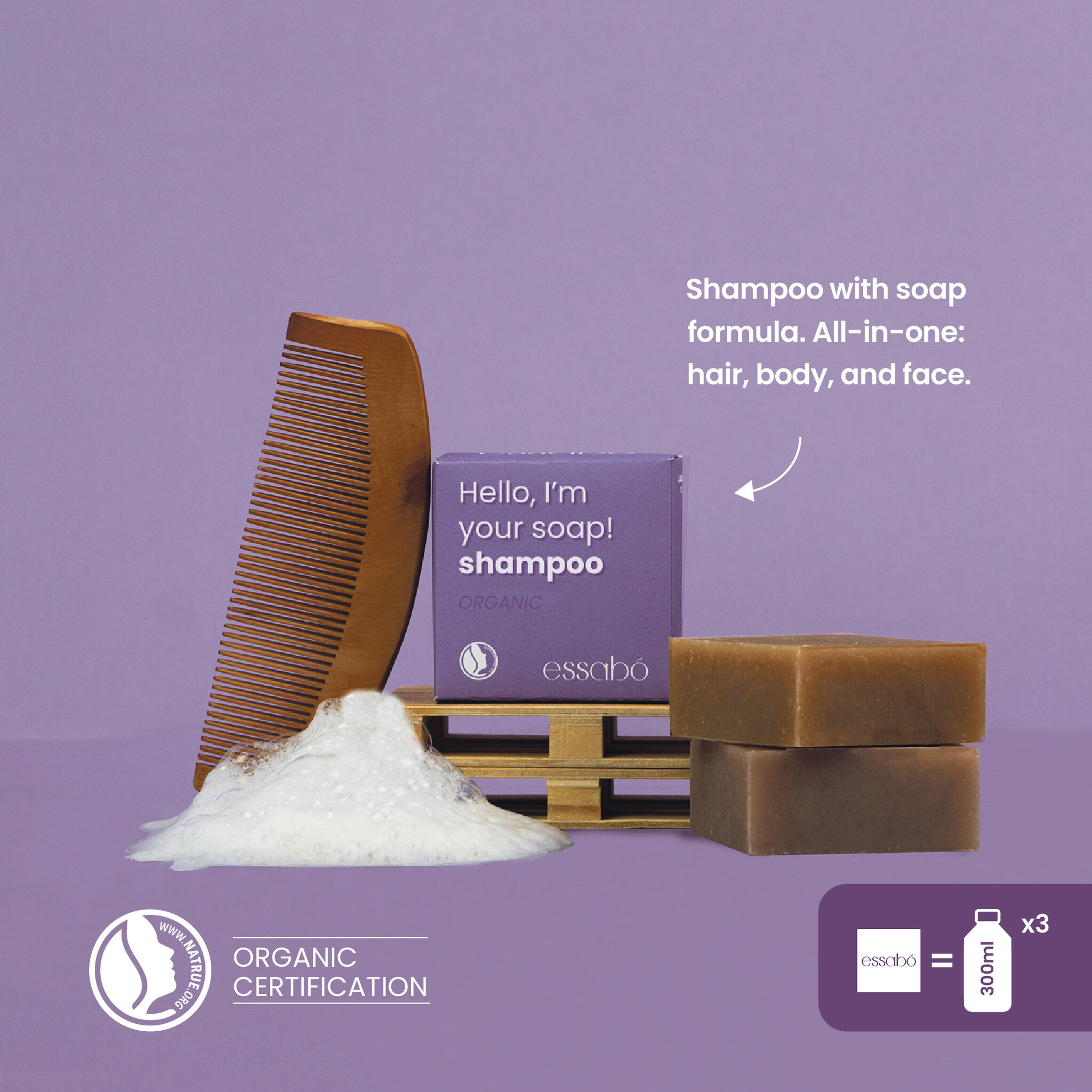 Shampoo Essabó is een specifieke eco-zeep die wordt gebruikt voor het wassen van haar en die is verrijkt met ecologische jojoba-olie, argan, honing, melk en aloë vera, dit zijn natuurlijke haarconditioners. De basis is gemaakt met kokosolie van duurzame boerderijen in de Filippijnen.