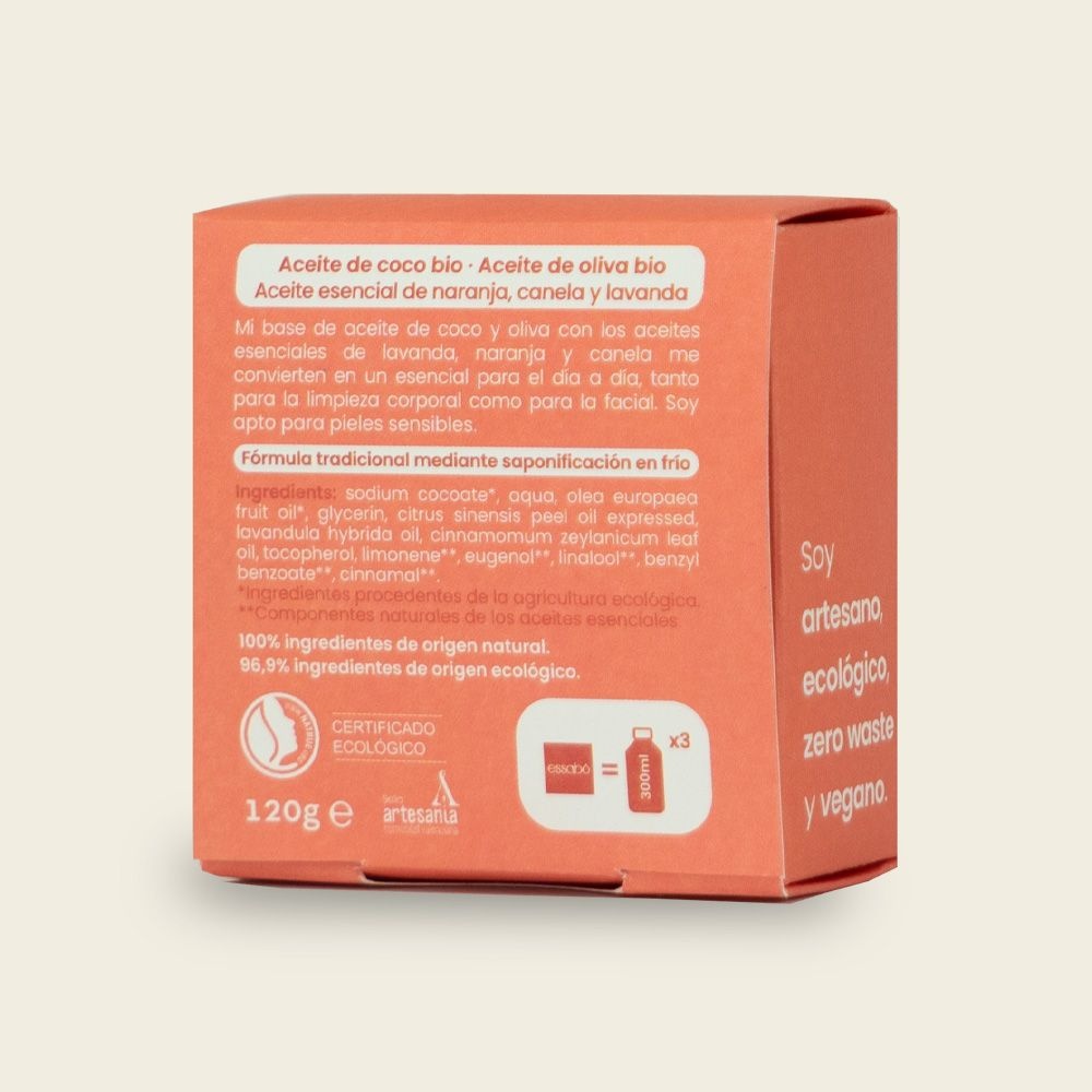 Essabó Essential is een cosmetische shower bar op smaak gebracht met essentiële oliën van lavendel, kaneel en sinaasappel . De basis is gemaakt met kokosolie uit duurzame landbouw en olijfolie uit Spaanse biologische gewassen.