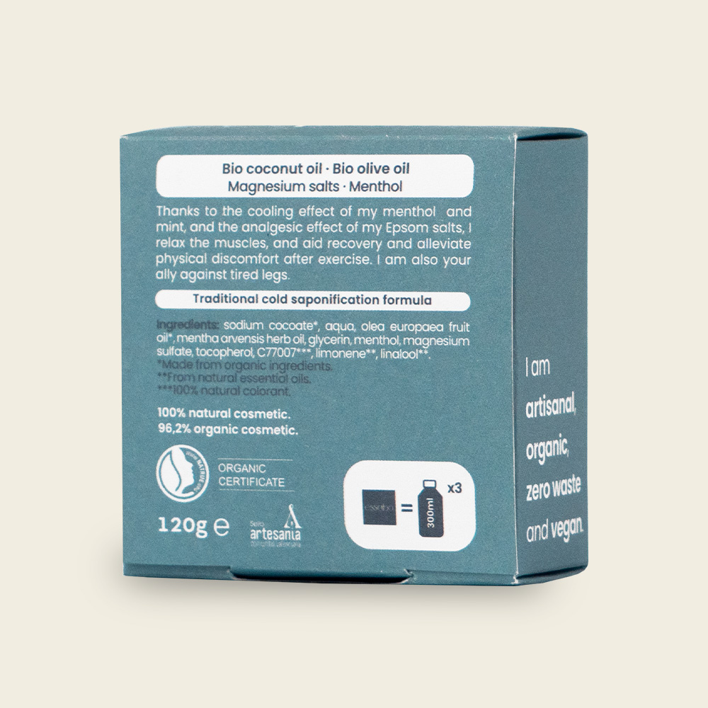 Essabó Sports is een shower bar die na het sporten reinigt, verfrist en spierherstel bevordert. Dankzij het koude effect van de menthol en het pijnstillende effect van de magnesiumzouten, ontspant het de spieren en verlicht het fysieke ongemakken na het sporten.