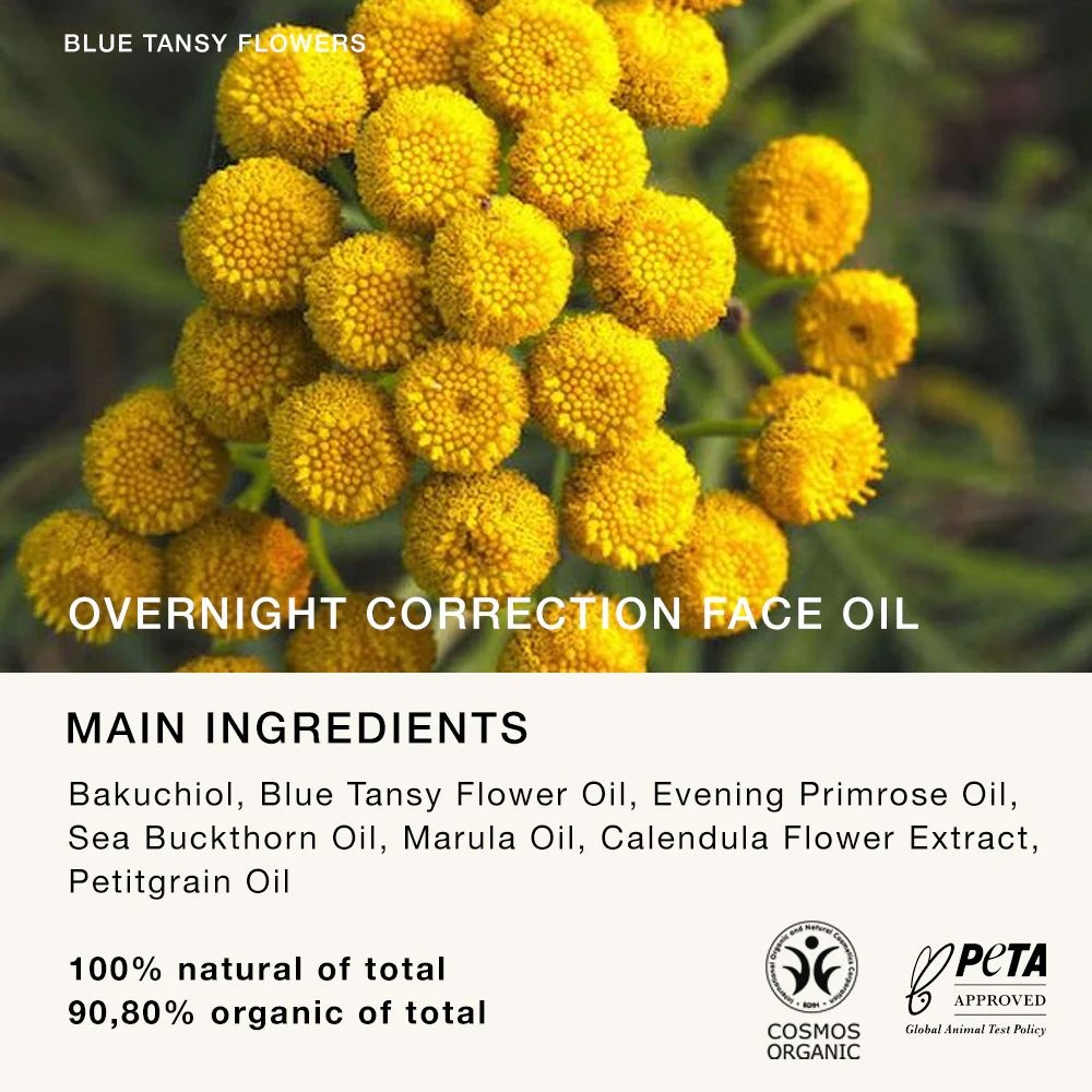 Ingredieten: Caprylic/Capric Triglyceride*, Simmondsia Chinensis Seed Oil* (Jojoba oil), Parfum***, Prunus Armeniaca Kernel Oil* (Apricot kernel oil), Helianthus Annuus Seed Oil* (Sunflower Seed oil), Argania Spinosa Kernel Oil* (Argan oil), Sclerocarya Birrea Seed Oil* (Marula oil), Oenothera Biennis Oil* (Evening primrose oil), Rosa Canina Fruit Oil* (Rosehip oil), Tocopherol*** (Vitamin E), Bakuchiol***, Citrus Aurantium Amara (Bitter Orange) Peel Oil***, Hippophae Rhamnoides Fruit Oil*** (Sea buckthorn oil), Linalool**, Tanacetum Annuum Flower Oil*** (Blue Tansy Flower Oil), Geraniol**, Limonene**, Calendula Officinalis Flower Extract* (Calendula flower Extract), Citral**