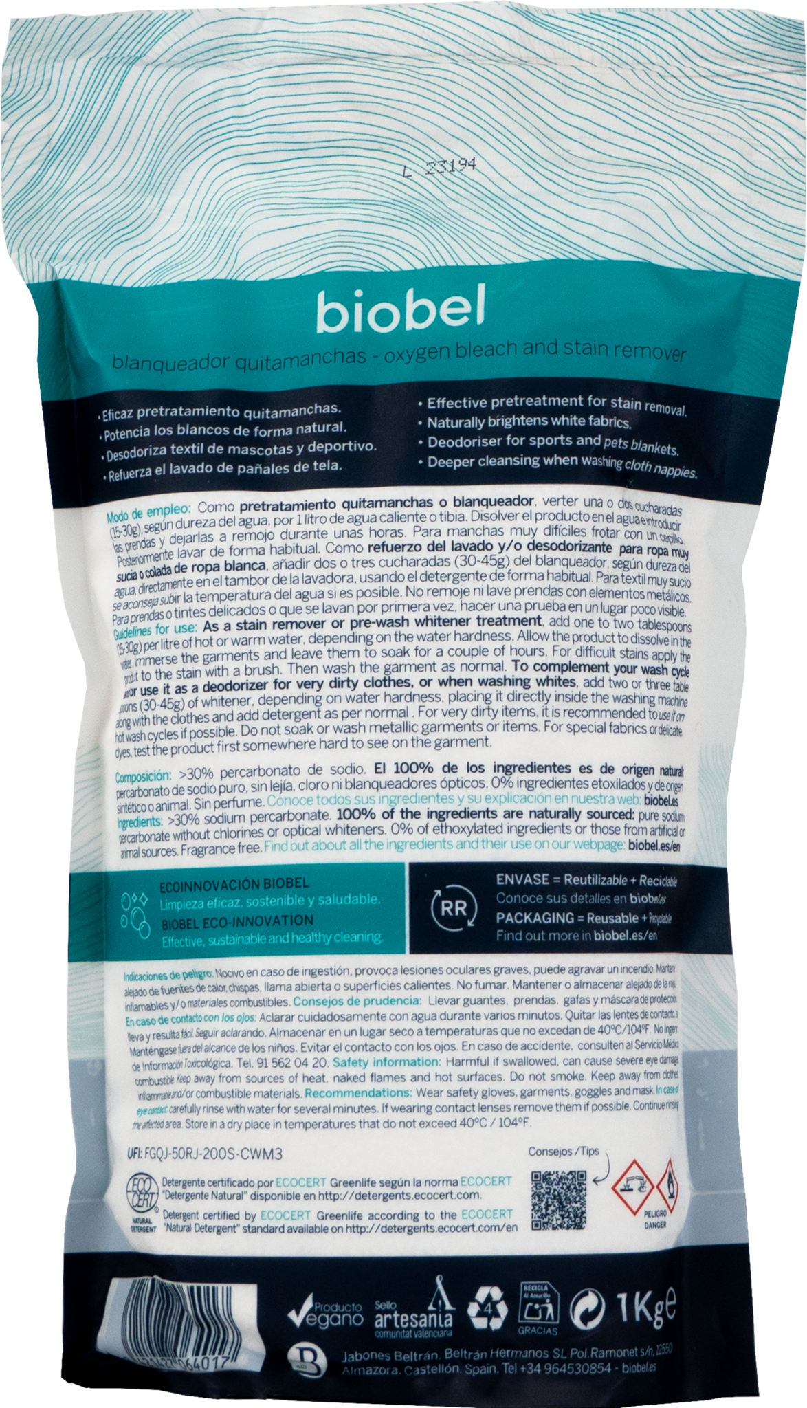 Vlekverwijderaar, bleekmiddel, desinfecterend en natuurlijke geurverdrijver voor alle soorten van kleding. Als voorwas behandeling verwijdert het vuil en moeilijke vlekken. Of om uw wasmiddel te versterken en effectiever te maken. Witte stoffen blijven helder wit. Vlekken worden effectief verwijdert, ook van gekleurde kleding zonder de kleur te vervagen.