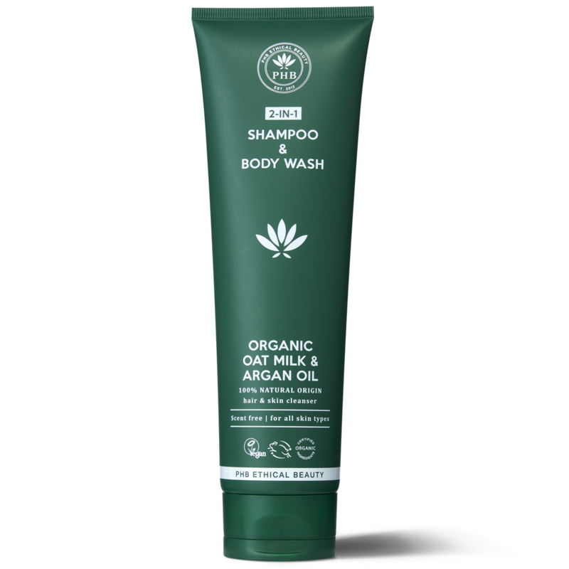 Met de 2-in-1 Shampoo & Body Wash van PHB Ethical Beauty verwelkom je eenvoudigheid in je leven. Deze multitasking reiniger voor haar en lichaam zorgt voor zacht, glanzend en gezond haar en verfrist en hydrateert de huid. Milde tensiden zorgen voor een zachte reiniging zonder uit te drogen. Een complex van biologische havermelk en arganolie zorgt voor sterker, gladder en vitaler haar en kalmeert tegelijkertijd de hoofdhuid. Biologische aloë vera zorgt voor extra hydratatie. De 2-in-1 Shampoo & Body Wash bevat geen etherische oliën en is geschikt voor alle huidtypes, ook de zeer gevoelige huid. Ook geschikt bij eczeem en voor baby's.