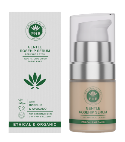 Het Gentle Face & Eye Serum van PHB Ethical Beauty voedt en verwent en zorgt voor een stralende, gezonde huid. Ideaal voor de gevoelige huid die tekenen van veroudering vertoont. Biologische saffloer olie verzacht, voedt en brengt de huid in evenwicht. Fruitzuren (AHA's) stimuleren de aanmaak van collageen en elastine en zorgen voor een egale, stralende huid. Biologische rozenbottel olie herstelt de jeugdige glans van de huid, verbetert de vochtbalans van de huid en vermindert fijne lijntjes en rimpels. Hyaluronzuur bindt vocht in de huid en zorgt voor een gehydrateerde, vollere huid. Biologische avocado olie hydrateert, verzacht en beschermt, verbetert de huidelasticiteit en vermindert ontstekingen. Het Gentle Face & Eye Serum bevat geen etherische oliën en is geschikt voor de gevoelige en/of droge huid, bij eczeem en gedurende zwangerschappen.