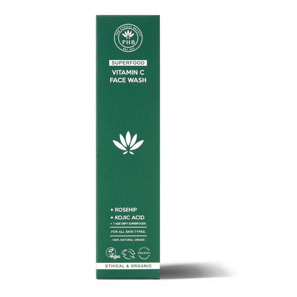 De Superfood Brightening Face Wash van PHB Ethical Beauty is een schuimende gezichtsreiniging die op milde wijze vuil en onzuiverheden verwijdert. Voor een jeugdige, gladde en heldere huid. Milde tensiden zorgen voor een zachte reiniging van de huid. Groene thee extract werk ontstekingsremmend, regenererend en beschermend. Aloë vera hydrateert, verzacht en bevordert het huidherstel. Zoethoutwortelextract brengt de huid tot rust, vermindert hyperpigmentatie en werkt antibacterieel. Vitamine C en vitamine E gaan effectief tekenen van veroudering tegen en zorgen voor een stralende, heldere huid. Konjinezuur verheldert de huid en vermindert de zichtbaarheid van pigmentvlekken. Bevat verder o.a. hyaluronzuur, neroli olie, granaatappelpitolie en curcuma olie. De Superfood Brightening Face Wash is geschikt voor alle huidtypes en in het bijzonder voor de rijpere huid.