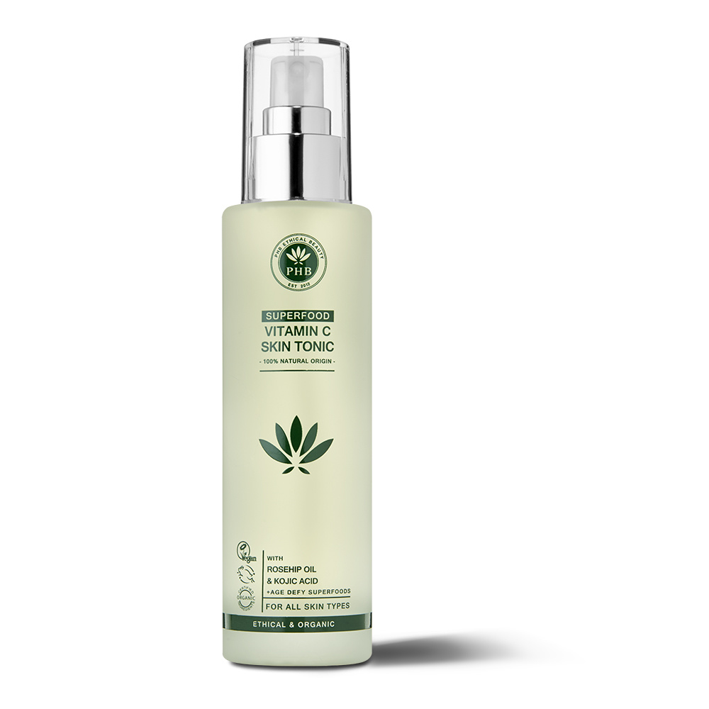 De Superfood Vitamin C Skin Tonic van PHB Ethical Beauty is een verzachtende gezichtstonic die de huid reinigt en hydrateert. Het helpt de pH-waarde en talgproductie in evenwicht te brengen en verkleint de poriën. Aloë vera hydrateert, verzacht en voedt de huid. Groene thee is rijk aan antioxidanten, verbetert de huidtextuur en vermindert de zichtbaarheid van huidveroudering. Zoethoutwortelextract brengt de huid tot rust, vermindert pigmentvlekken en werkt antibacterieel. Hyaluronzuur hydrateert intensief en helpt de huid bij het vasthouden van vocht. Vitamine C gaat effectief tekenen van veroudering tegen en zorgt voor een stralende, heldere huid. Konjinezuur verheldert en zorgt voor een egaler huidbeeld. Bevat verder o.a. vitamine E, rozenbottelolie, vanille extract en curcuma olie. De Superfood Vitamin C Skin Tonic is geschikt voor alle huidtypes en in het bijzonder voor de rijpere huid.