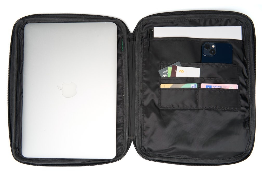 De A4 schrijfmap Practical Parrot is perfect voor professionals die graag georganiseerd blijven. Hij is groot genoeg om A4-documenten en notitieblokken in op te bergen, evenals visitekaartjes en pennen. Er kan ook een 13 inch laptop ingeschoven worden. De map heeft een sluiting met een stevige waterdichte rits, om ervoor te zorgen dat je spullen veilig opgeborgen blijven.