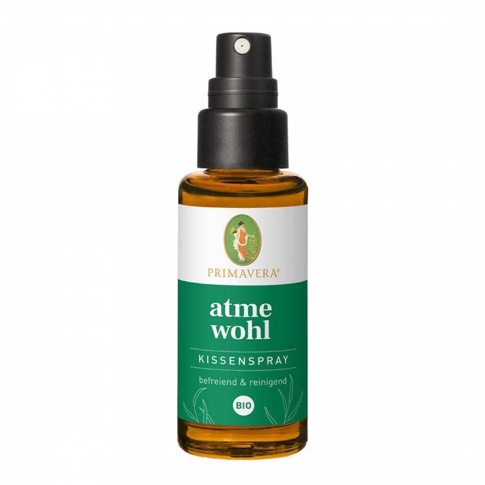 De bevrijdende Adem Vrij (Atme Wohl) Kussenspray van Primavera bestaand uit volledig natuurzuivere etherische oliën van eucalyptus en alpenden stimuleert tot diep doorademen en ondersteunt een gezonde slaap. De Adem Vrij Kussenspray bevrijdt van kiemen en verfrist het textiel. Vegan.