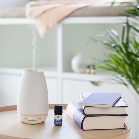 De hoogwaardige Aroma Diffuser Ambiente van Primavera biedt bevochtigt de ruimte, zorgt voor een heerlijke geur en is tegelijkertijd een subtiel sfeerlicht. Het keramieken bovendeel laat het licht van binnenuit zacht doorschijnen. De ultrasone geluidtechniek verdeelt het water en de etherische oliën in zeer fijne deeltjes en zorgt door koude verneveling voor een aangename geur en bevochtiging van de lucht. De nevel en het licht kunnen gescheiden geregeld worden. De vernevelaar kan 1 of 2 uur achtereen actief zijn of activeer de 6 uurs intervalfunctie. Het licht is in drie standen regelbaar. Het geurbereik bedraagt 4 tot 5 meter.