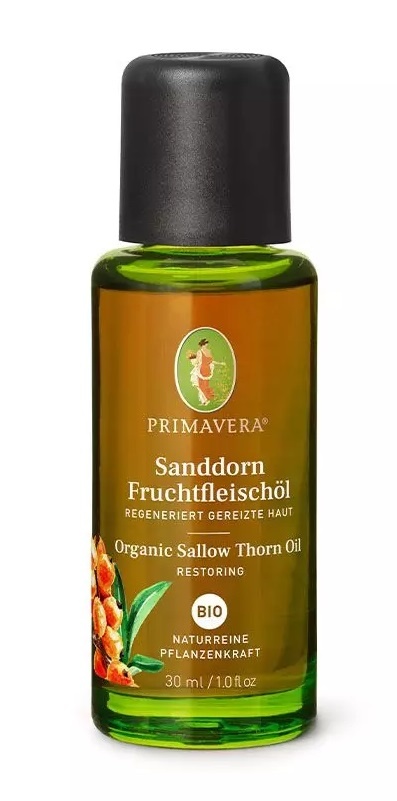 De Biologische Duindoorn Olie van Primavera is een zuivere olie van het vruchtvlees van duindoorns. De oranjerode olie beschermt de huid voor schade door vrije radicalen, herstelt en werkt ontstekingsremmend. Bijzonder geschikt voor de rijpere huid en kalmerend bij de droge, geïrriteerde huid. Duindoornolie regenereert en kalmeert de zwaar belaste huid. Rijk aan vitamine E en provitamine A die vrije radicalen afweren en de huid tot rust brengen. De olie versterkt de huideigen beschermende barrière en geeft de huid nieuwe kracht.
