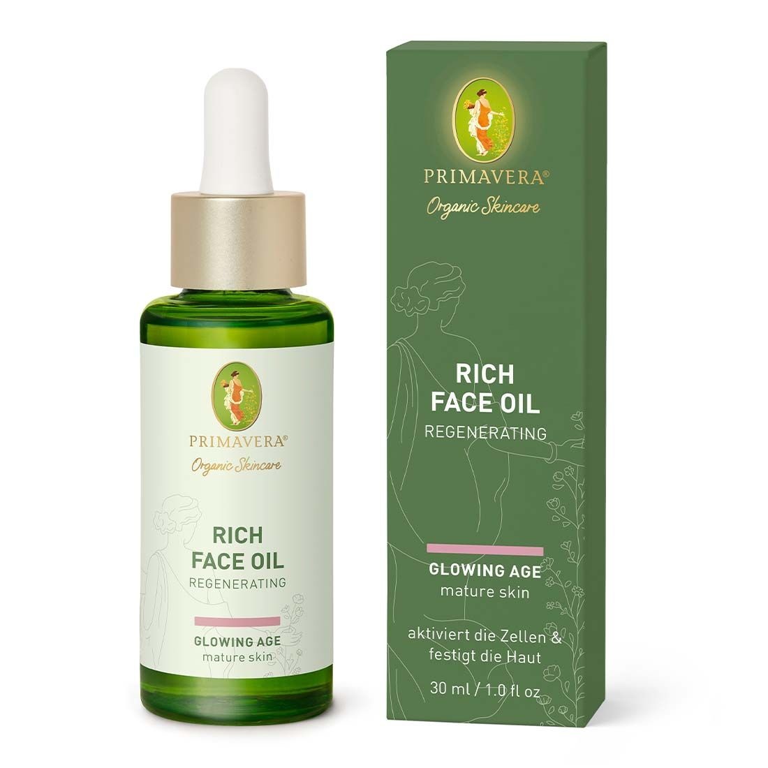 De Rich Face Oil - Regenerating van Primavera is een natuurlijke gezichtsolie en een weldaad voor huid en zintuigen. De lichte gezichtsolie voor de rijpere huid geeft de huid stevigheid en werkt vochtinbrengend. Geurend, weldadig en effectief laat het jouw individuele schoonheid stralen. Met de natuurlijke plantenkrachtcompositie van Cacay olie en passievruchtolie activeert deze gezichtsolie de microcirculatie van de huid en verbetert het zo de huidelasticiteit en -regeneratie. De waardevolle Cacay olie is een echt geschenk uit de natuur. Bijzonder rijk aan omega-6 en 9 vetzuren, beschermt het de huid voor oxidatieve stress en zorgt het voor een egaal en ontspannen huidbeeld. De Rich Face Oil - Regenerating is vegan.
