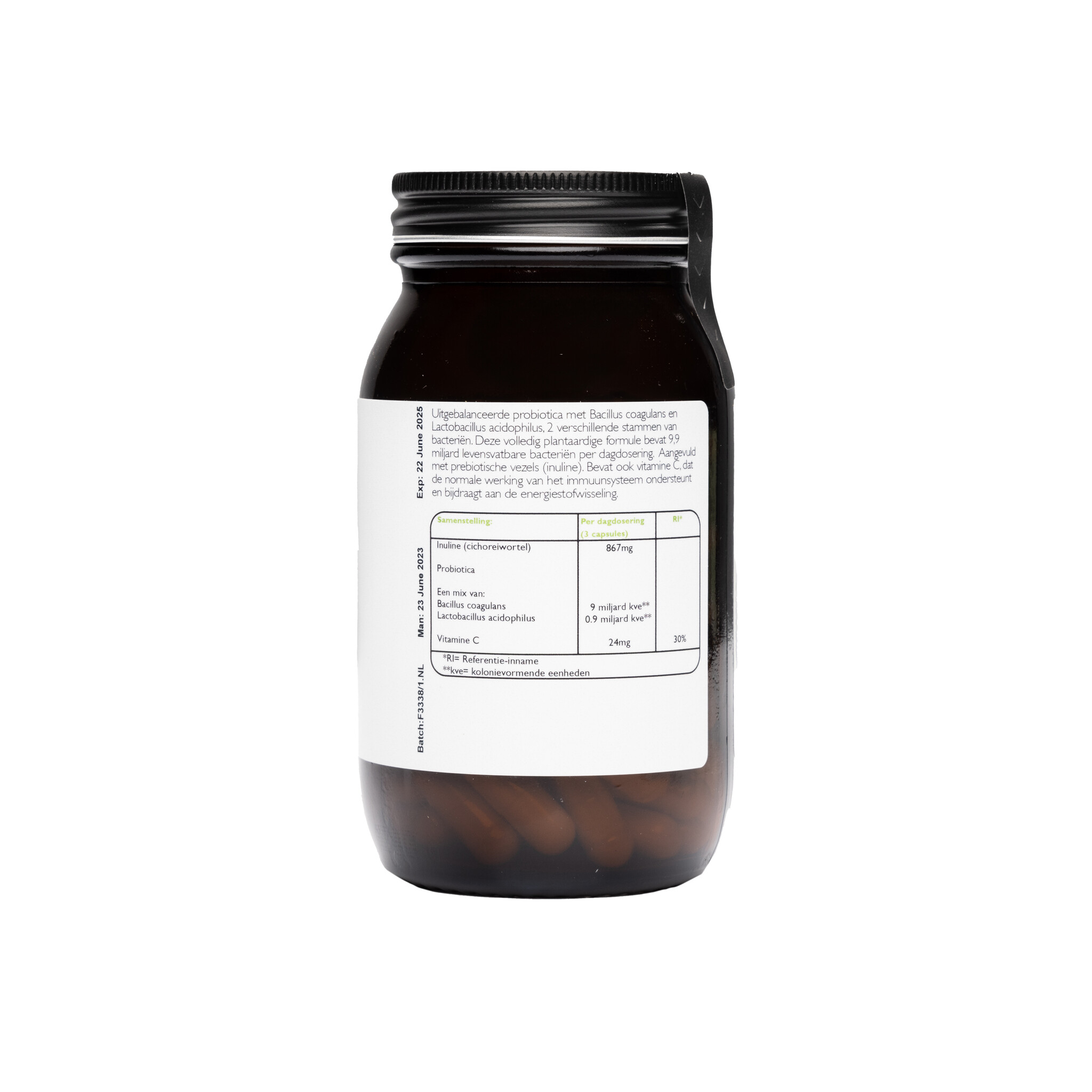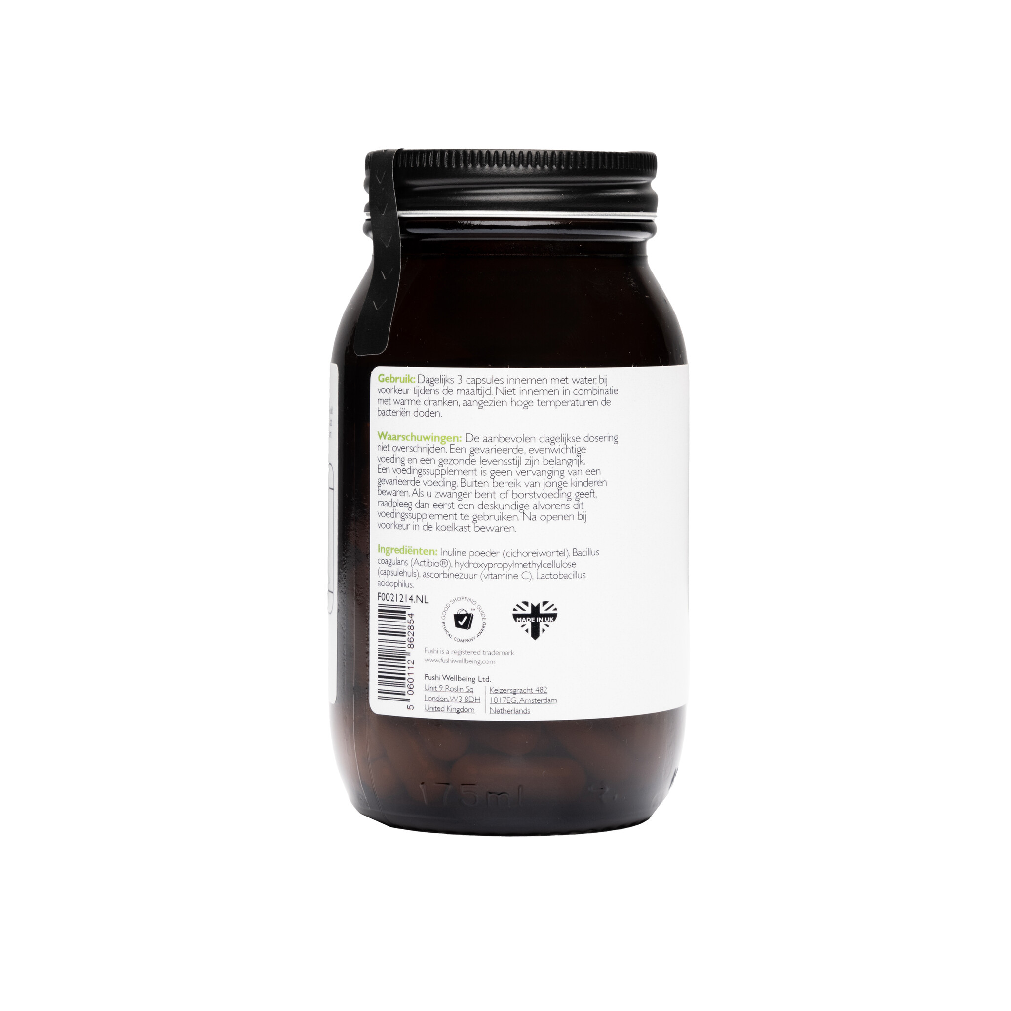Ingrediënten: Inuline poeder (cichoreiwortel), Bacillus coagulans (Actibio®), hydroxypropylmethylcellulose (capsulehuls), ascorbinezuur (vitamine C), Lactobacillus acidophilus.