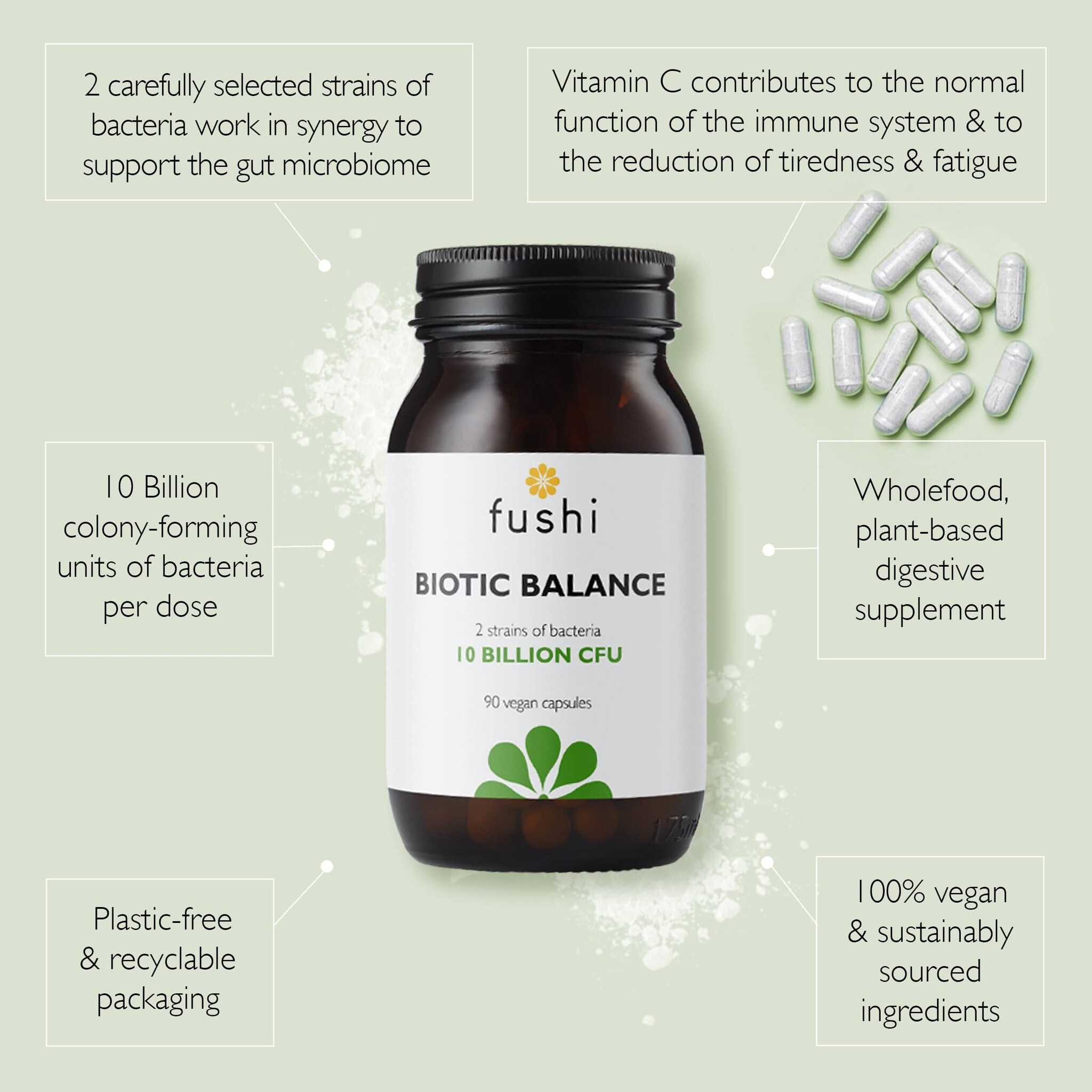Uitgebalanceerde probiotica met Bacillus Coagulans en Lactobacillus acidophilus, 2 verschillende stammen van bacteriën. Deze volledig plantaardige formule bevat 9,9 miljard levensvatbare bacteriën per dagdosering. Deze bevorderen de groei van gunstige darmbacteriën, waardoor spijsverteringsklachten zoals winderigheid, een opgeblazen gevoel en onregelmatigheden mogelijk kunnen worden verlicht. Aangevuld met prebiotische vezels (inuline). Gecombineerd met extra vitamine C, dat de normale werking van het immuunsysteem ondersteunt en bijdraagt aan de energiestofwisseling.