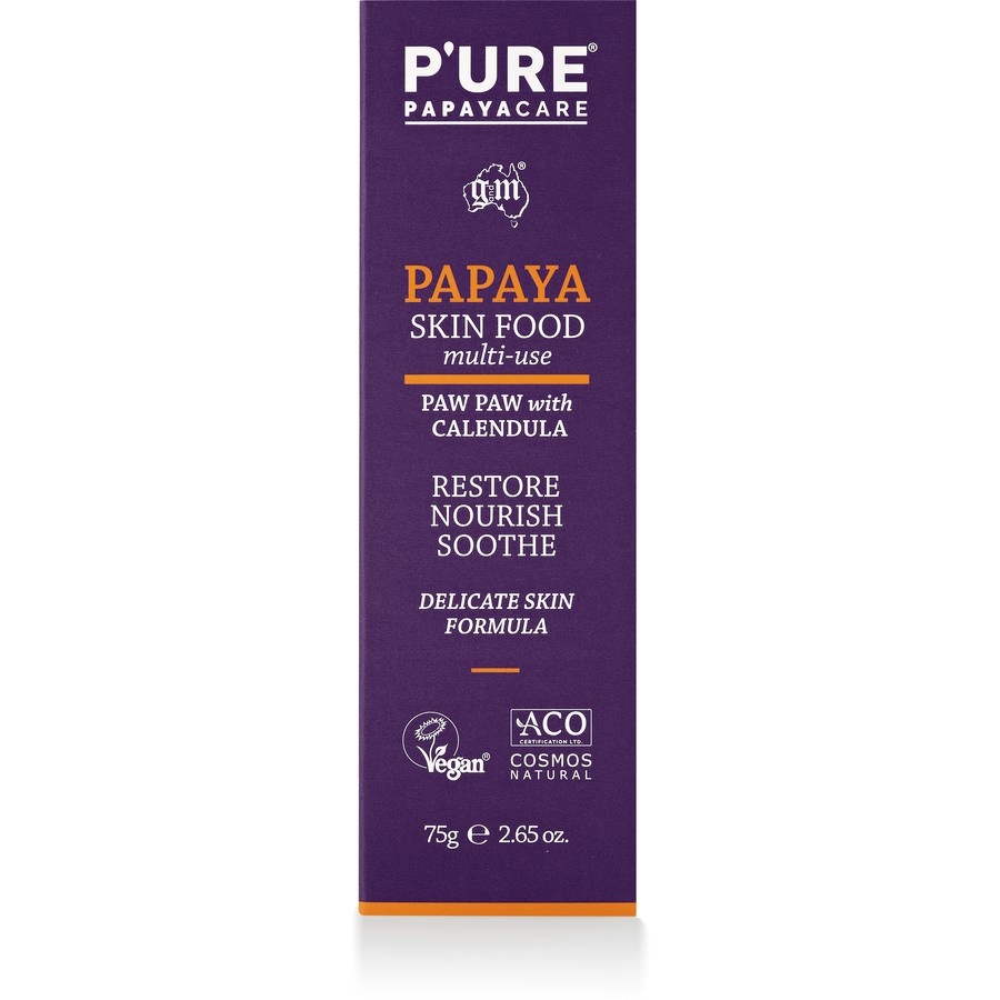 P'URE Papayacare Papaya Skin Food bevat een rijke voedende mix van papaja, sheaboter en Calendula die de droge, gebarsten en geïrriteerde huid onmiddellijk voedt, herstelt en verzacht. Deze multifunctionele balsem is ultrarijk en verzacht, herstelt en beschermt je huid op natuurlijke wijze. Samengesteld zonder petroleum, parabenen, sulfaten, kunstmatige kleur- en geurstoffen. Eén tube, vele toepassingen: Biedt verlichting na een lasertherapiebehandeling, verzorging na de zon, verzacht luieruitslag en berg, geeft verlichting bij gebarsten tepels, hielen en handen. Aanbevolen voor droge, gebarsten en geïrriteerde huid.