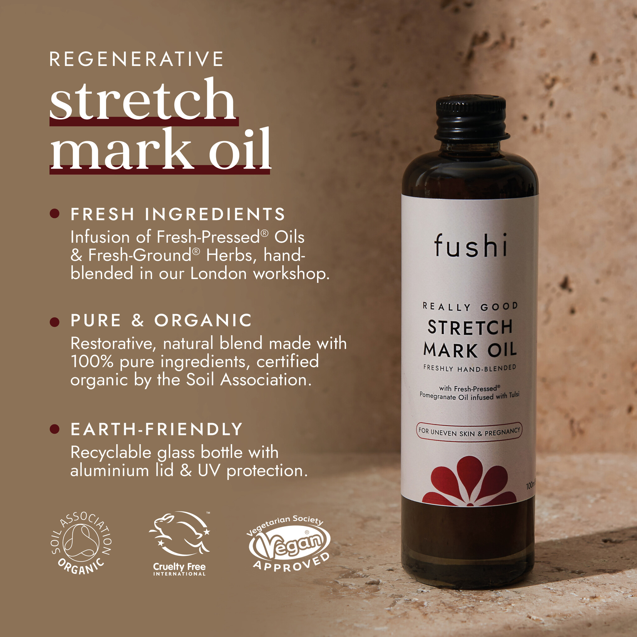 Fushi Really Good Stretch Mark Oil is een gespecialiseerde, uitgebalanceerde natuurlijke formule die het uiterlijk van striae, littekens en een ongelijkmatige teint helpt verbeteren. Geformuleerd met behulp van een innovatieve interne infusietechnologie, bevat het drievoudige sterkte Indiase Tulsi, ook wel bekend als Heilige Basilicum vanwege zijn uitstekende helende krachten op de huid en bekende voordelen voor striae. Gemengd met Afrikaanse baobabolie, die de eigenschappen van omega 3, vitamine E en D bevat, is het ideaal voor littekens, vlekken en striae. Deze werken samen met vitamine E-rijke tarwekiemolie en avocado-olie, die de huid versterken en helpt om sneller te genezen. En tot slot gecombineerd met de krachtige granaatappelolie en grapefruitzaadolie zal deze formulering de huid effectief versterken en de elasticiteit van de huid bevorderen. Deze vegan en ongeparfumeerde anti striae olie is 100% biologisch, koudgeperst en bevat geen alcohol, siliconen, parabenen, petrochemicaliën, SLS, PEG's en kunstmatige parfums en is veilig voor gebruik tijdens zwangerschap.