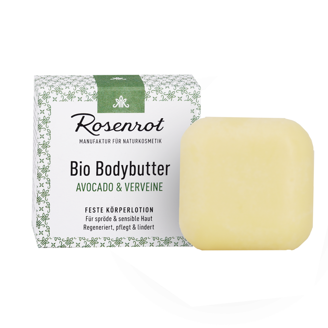 De Vaste Bio Bodybutter Avocado & Verveine van Rosenrot is een biologische vaste body butter met verzorgende biologische avocado olie. Deze heerlijke verzorgende body butter smelt langzaam bij aanraking van de huid en laat zich dan gemakkelijk verdelen en inmasseren. Geschikt voor alle huidtypes, maar in het bijzonder voor de droge huid een echte weldaad. Ruwe huiddelen, zoal handen, voeten, ellebogen en knieën profiteren van deze rijke verzorging en in de winter is het een fijne bescherming voor het gezicht bij koude (bevat geen water). Met een zachte verveinegeur, voor liefhebbers van citrusfrisse geuren.