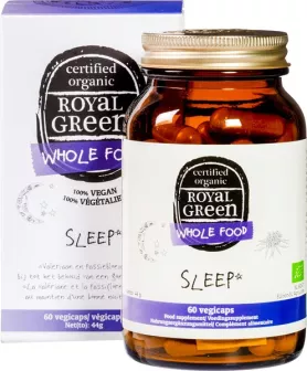Royal Green Whole Food Sleep Vegicaps bevatten 100% biologische gecertificeerde ingrediënten, zoals valeriaan en passiebloem die bijdragen aan het behoud van een goede nachtrust. Dit voedingssupplement bevat ingrediënten zoals zeewier-magnesium, valeriaan, gotu kola, passiebloem, citroenmelisse en lavendel. Deze zorgvuldig gekozen componenten werken samen om elkaars effect te versterken. Daarbij zorgt Royal Green goed voor de planeet en ondersteunt biologische boerderijen en duurzame landbouw over de hele wereld.