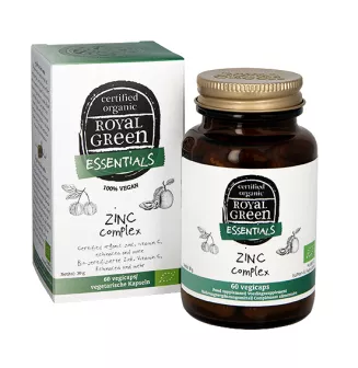 Een biologisch zink supplement zonder vulmiddelen van Royal Green. Zinc complex levert 100% gecertificeerd biologische zink (uit guave) samen met een combinatie van vitamine C (uit acerola), echinacea, thijm, geelwortel, maitake, ginseng en pompoenzaadolie.