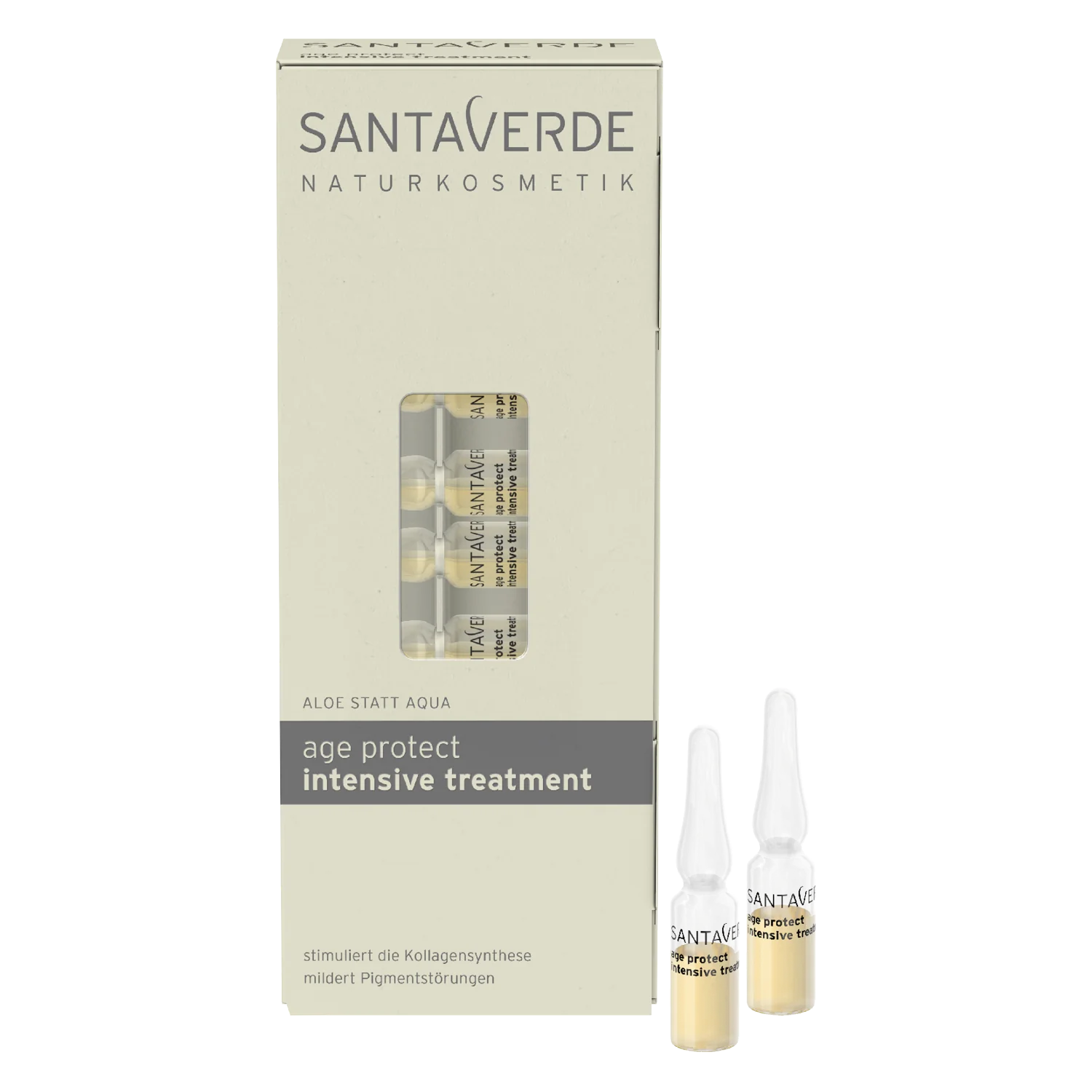 De Santaverde Age Protect Intensive Treatment stimuleert de collageensynthese en vermindert pigmentstoringen. Dit concentraat van intensief regenererende werkzame stoffen verzorgt de huid met waardevolle opbouwende stoffen en versterkt de huidbarrière. Zuiver aloë vera sap en hyaluron optimaliseren direct de vochthuishouding van de huid. De samenstelling van antioxidatieve aloë vera bloemen, duindoornbes-extract en appelextract beschermt de huid voor de schadelijke invloed van vrije radicalen. Waardevolle wortelextracten stimuleren de collageensynthese en werken regulerend op de melanineproductie. De ampullen verzachten en regenereren de veeleisende, gevoelige, beschadigde huid en zorgt voor een gladdere, egalere huid.