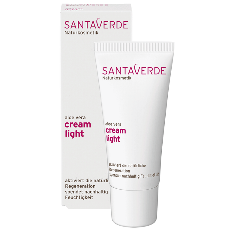 De Aloe Vera Cream Light van Santaverde is een lichte gezichtscrème die de huid hydrateert en regenereert en voor een soepele, zachte huid zorgt. Zuiver aloë vera sap activeert de natuurlijke regeneratie en hydrateert de huid intensief in combinatie met hyaluronzuur. Celbeschermend appelextract zorgt voor een elastische huid. Zoete amandelolie en squalaan uit olijf verzorgen de huid met kalmerende en verzorgende actieve stoffen. De crème wordt snel door de huid opgenomen en na gebruik is de huid gehydrateerd en verzorgt. De Aloe Vera Cream Light is geschikt voor de normale en gecombineerde huid.