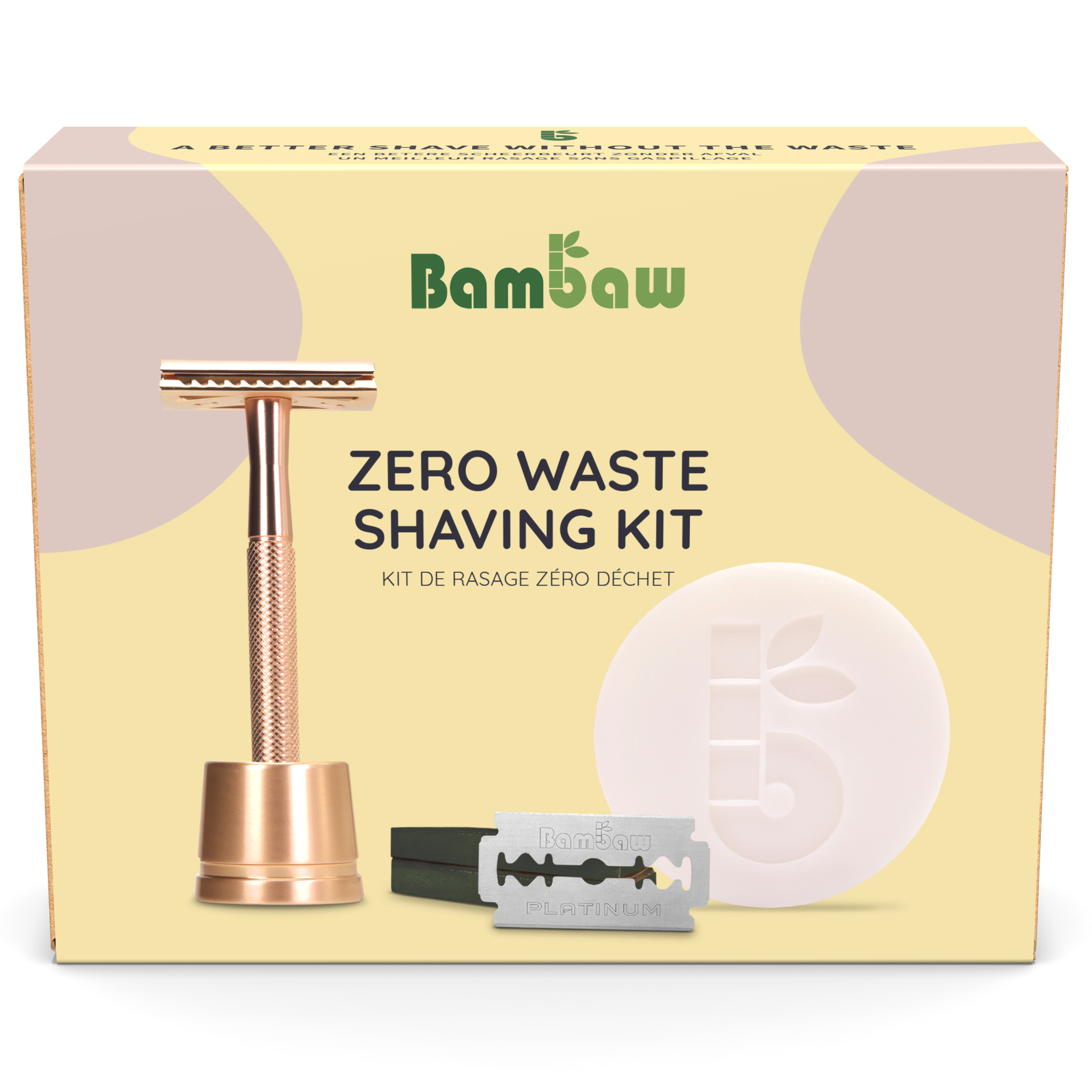 De duurzame geschenkdoos bevat onze meest populaire scheerartikelen: een roségouden metalen veiligheidsscheermes met standaard, een hydraterende abrikozenscheerzeep en twee pakjes met elk vijf Bambaw scheermesjes.