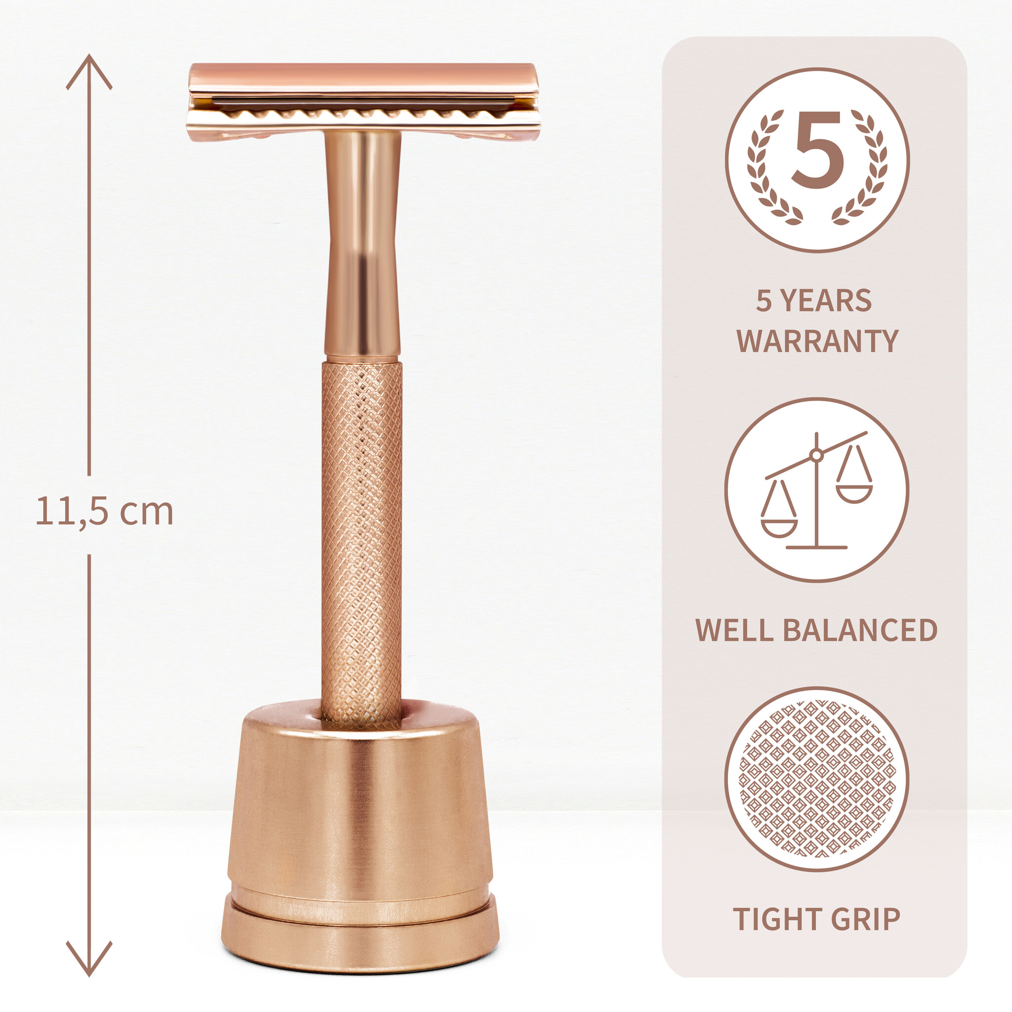 Het scheermes is volledig gemaakt van messing en is roestbestendig. Bovendien zorgt de standaard ervoor dat het mesje langer meegaat door aantasting door water te voorkomen.