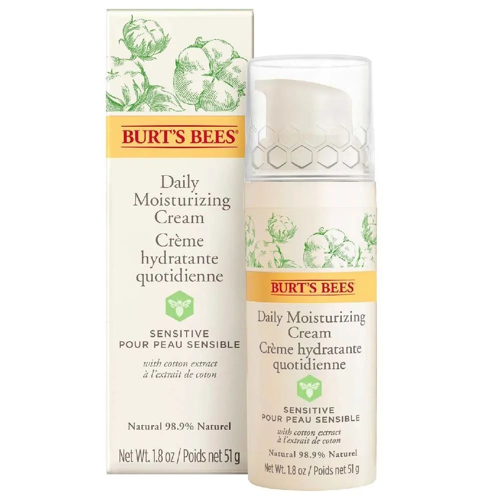 Burt´s Bees Sensitive Daily Moisturizing Cream hydrateert de gevoelige huid de hele dag zonder roodheid of irritatie te veroorzaken. De speciale formule met katoenextract helpt de buitenste huidlaag te voeden en minimaliseert het effect van potentieel irriterende stoffen, zoals agressieve zepen en detergenten. Rijstextract hydrateert de huid en aloë vera kalmeert de huid. Natuurlijk mild voor dagelijks gebruik.
