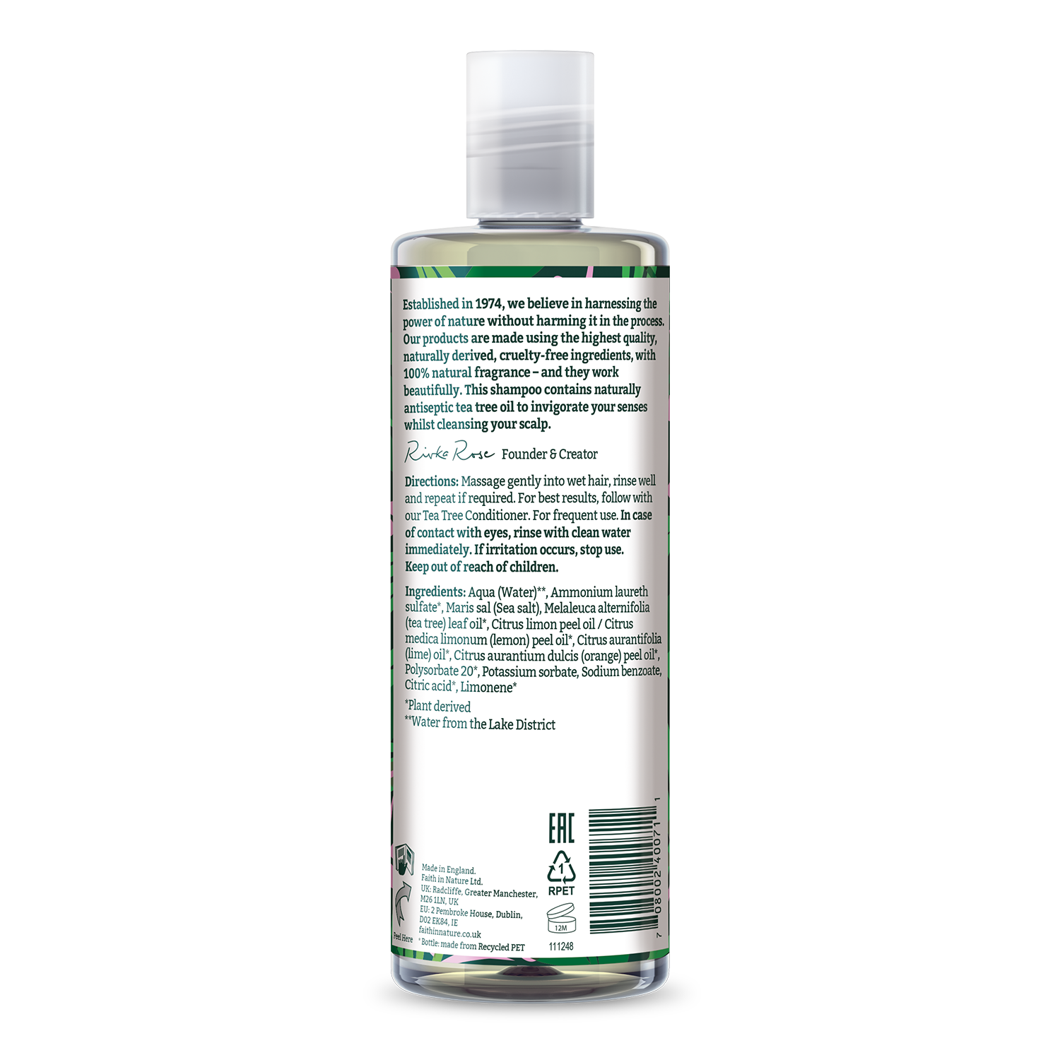 Faith in Nature Tea Tree Shampoo reinigt diepgaand het haar en verbetert zichtbaar de conditie van je haar en van je hoofdhuid. Speciaal ontwikkeld voor normaal tot vet haar. Dankzij zijn hoge concentratie aan tea tree en essentiële oliën van citrus wordt vet haar op de juiste manier aangepakt zonder het uit te drogen. Tea tree staat bekend om zijn antibacteriële, antiseptische en antischimmel eigenschappen waardoor de hoofdhuid niet alleen van overtollige talg wordt ontdaan, maar ook schadelijke bacteriën en onzuiverheden worden doeltreffend geëlimineerd.