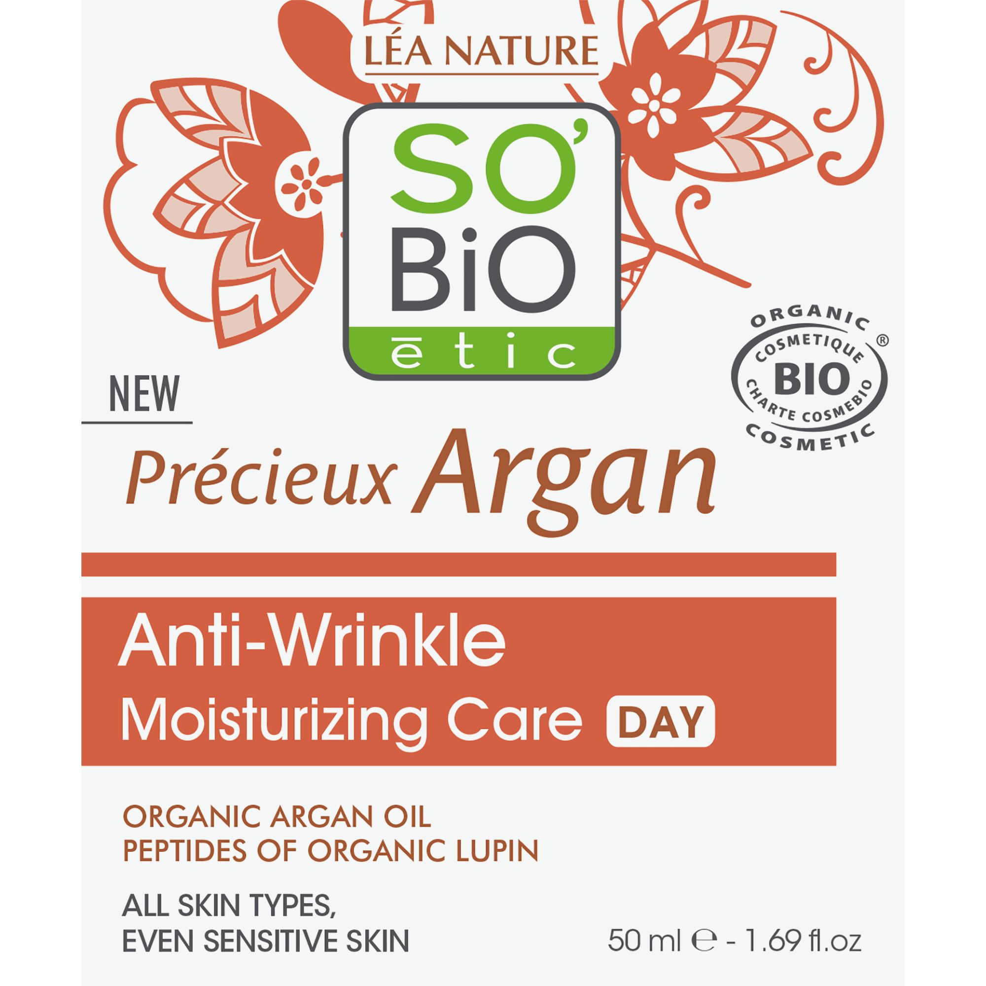 De Précieux Argan Anti-Wrinkle Moisturizing Day Care van SO'BiO étic is een hydraterende dagcrème met regenererende eigenschappen. De huid wordt direct intensief gehydrateerd en na regelmatig gebruik worden rimpels minder zichtbaar en wordt de huid steviger en voller. Biologisch kamillewater kalmeert, brengt de huid tot rust en bevordert het huidherstel. Biologische arganolie is rijk aan vetzuren en vitamine E om de tekenen van huidveroudering te bestrijden. Biologische lupine peptides activeren de collageen productie en verbeteren de huidelasticiteit. Bevat verder o.a. melkzuur en hyaluronzuur. De Précieux Argan Anti-Wrinkle Moisturizing Day Care is geschikt voor alle huidtypes, ook de gevoelige huid.