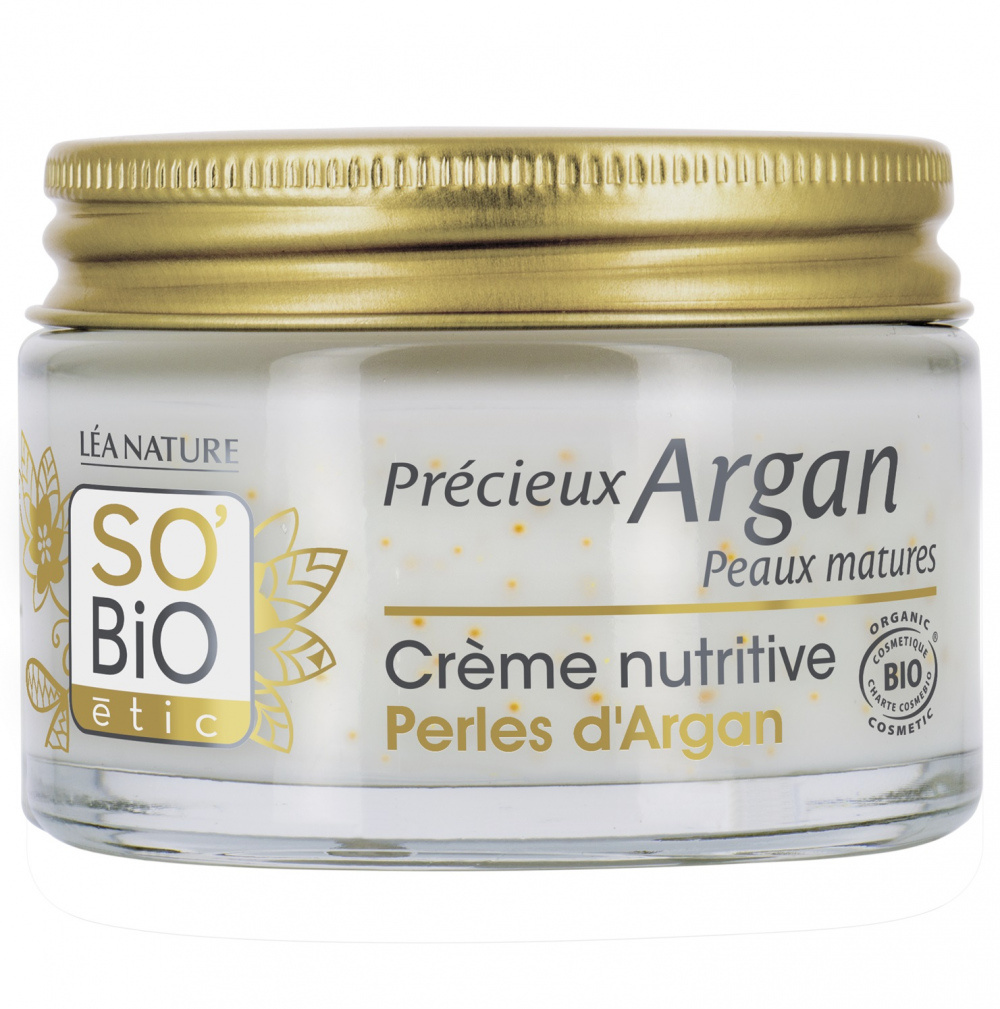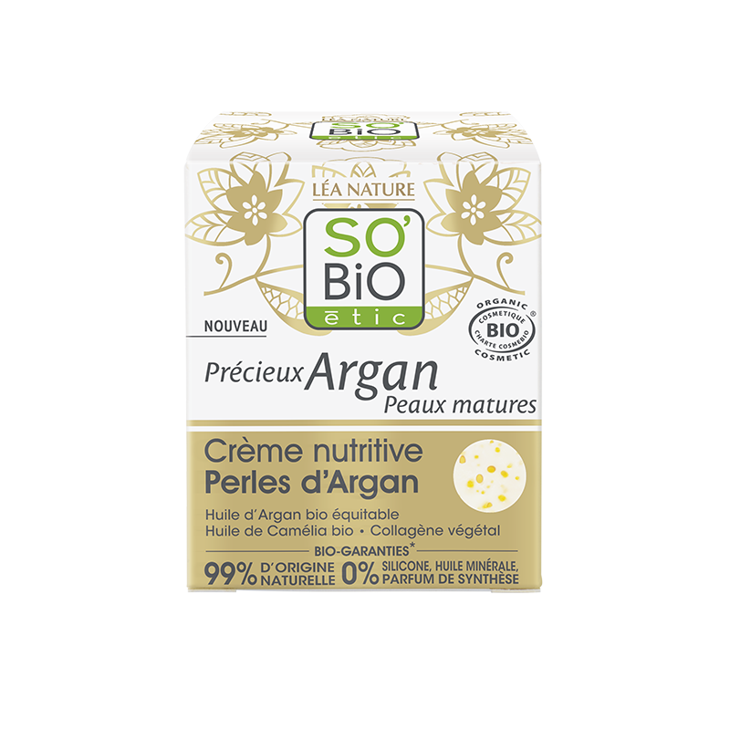 De Précieux Argan Argan Pearls Nourishing Cream van SO'BiO étic is een voedende gezichtscrème voor de rijpere huid. De crème bevat unieke parels van pure arganolie die versmelten zodra de crème wordt aangebracht. Dit geeft een optimale voeding voor de normale tot droge huid. Camelia olie verbetert de huidstructuur en een plantaardige collageenbooster op basis van algen verstevigt de huid. Verrijkt met vitamine E, een krachtige antioxidant die de huid beschermt voor veroudering. De Précieux Argan Argan Pearls Nourishing Cream is vegan en de biologische arganolie wordt fair trade geproduceerd.