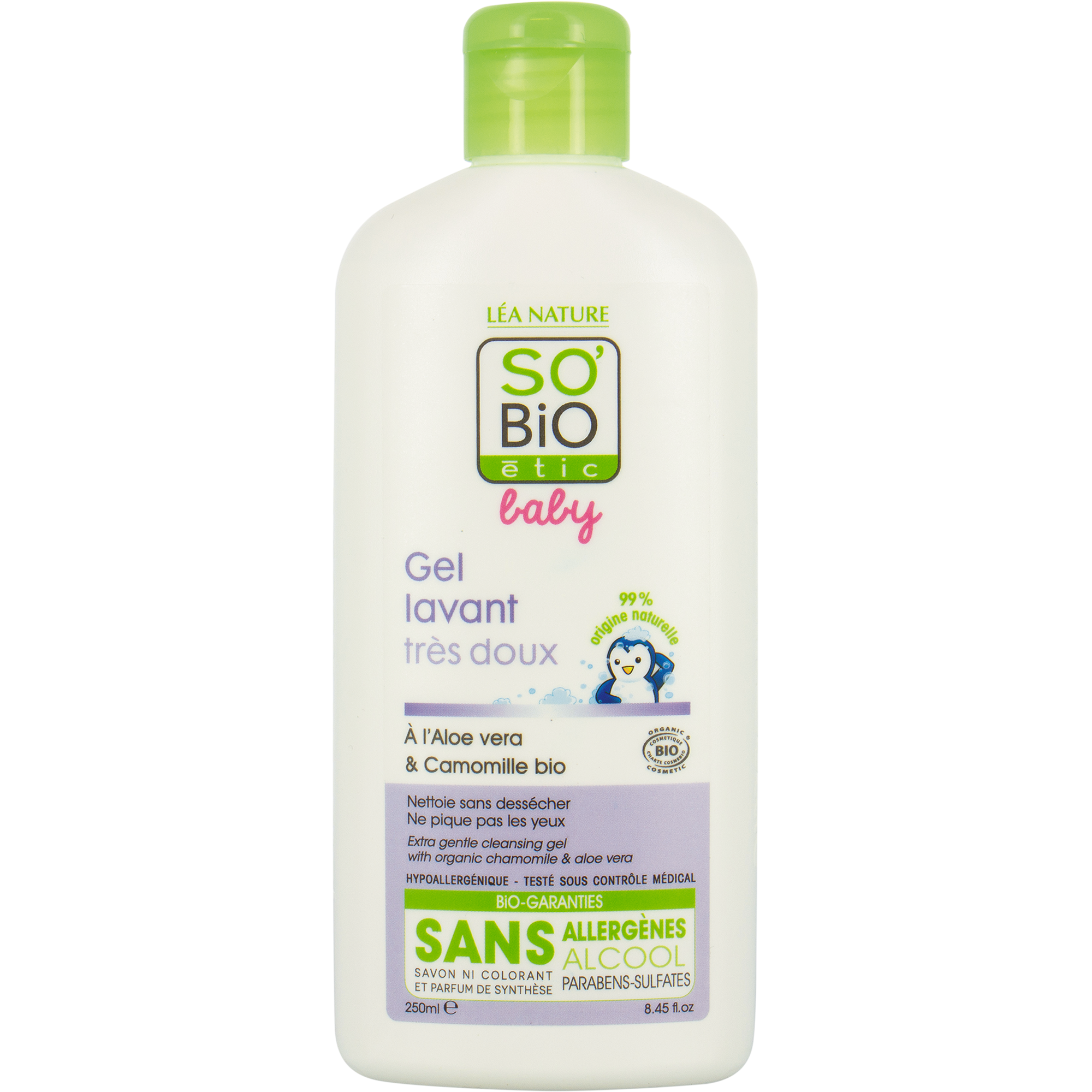 De Baby Extra Gentle Cleansing Gel van SO'BiO étic is een milde, natuurlijke reiniging voor het haar en de huid van je kleintje. Na gebruik voelt de huid schoon en zacht en het haar is schoon en zijdeachtig. De formule bevat plantaardige glycerine om de huid te beschermen voor droogte als gevolg van hard water. Verrijkt met biologisch kamillewater en biologische aloë vera om haar en huid te hydrateren, kalmeren en verzachten en de natuurlijke huidbarrière te beschermen. De Baby Extra Gentle Cleansing Gel bevat geen kunstmatige kleurstoffen, parabenen of sulfaten.