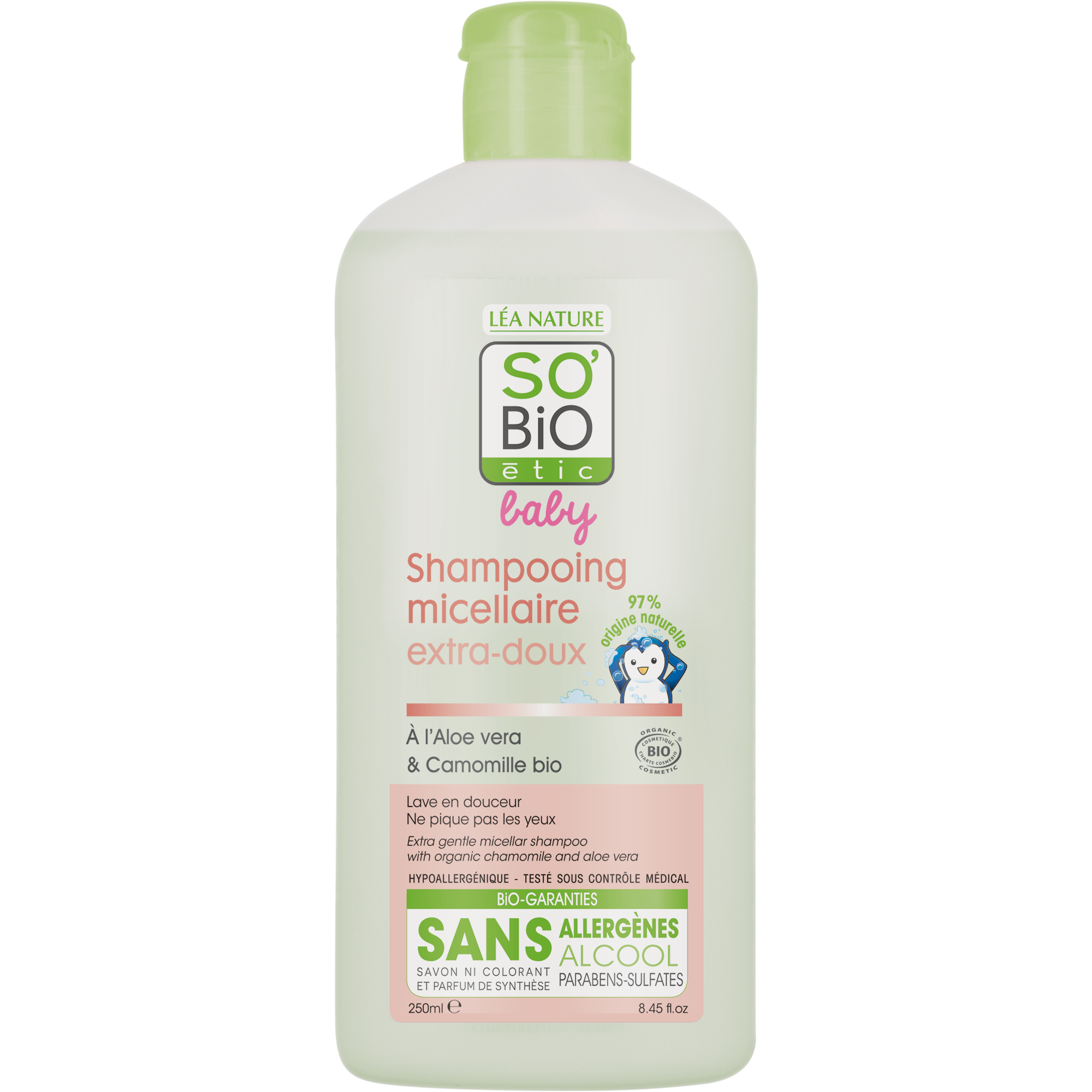 De Baby Micellar Shampoo van SO'BiO étic is een extra-milde micellair shampoo voor baby's. De shampoo reinigt haar en hoofdhuid van je kleintje op milde wijze en tast het evenwicht van de hoofdhuid niet aan. Voor schoon en zijdezacht haar. Verrijkt met biologisch kamillewater en biologische aloë vera om haar en hoofdhuid te hydrateren, kalmeren en verzachten. De Baby Micellar Shampoo bevat geen alcohol, parabenen of sulfaten.