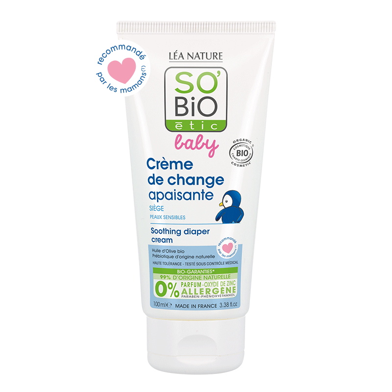De Baby Soothing Diaper Cream van SO'BiO étic is een milde crème die tijdelijke roodheid bij het luiergebied voorkomt en kalmeert. Zonnebloemolie hydrateert, verzacht en versterkt de huidbarrière. Olijfolie is rijk aan vitamine E en zorgt voor een beschermde, gehydrateerde huid. Kamillewater kalmeert, brengt de huid tot rust en bevordert het huidherstel. Bevat verder o.a. glycerine, aloë vera en hyaluronzuur. De Baby Soothing Diaper Cream kan gebruikt worden na de geboorte. 0% bekende allergenen en parfumvrij.