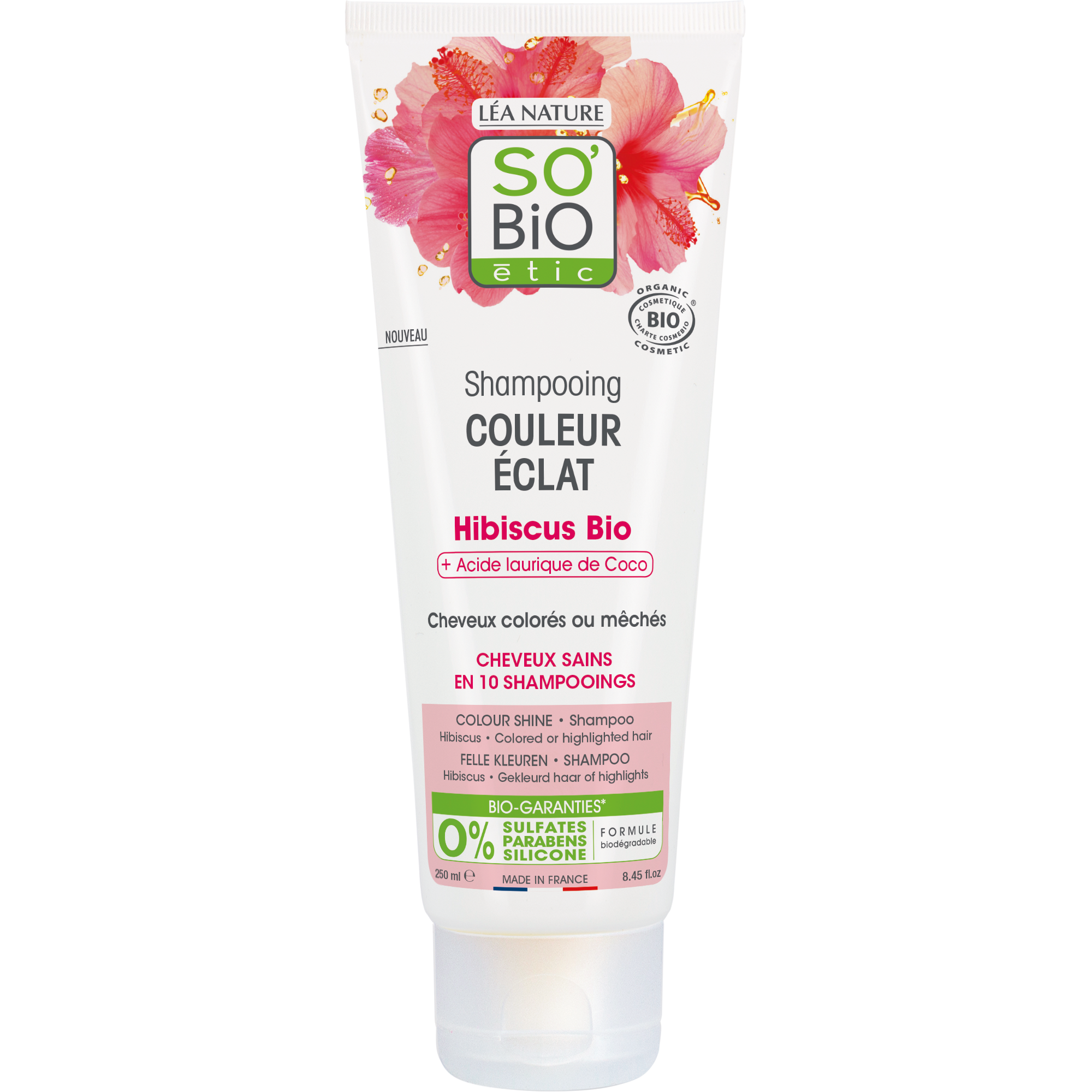 De Colour Shine Hibiscus Shampoo van So'BiO étic is een natuurlijke shampoo voor geverfd/gekleurd haar. De shampoo voedt en beschermt het haar en behoudt de glans van je haarkleur. Milde tensiden zorgen voor een zachte reiniging zonder te irriteren of uit te drogen. Kokosolie en saffloerolie hydrateren, beschermen en voeden het haar en zorgen voor zacht, gezond haar. Hibiscus werkt hydraterend en antioxidatief. Bevat verder o.a. aloë vera, glycerine en proteïne. De Colour Shine Hibiscus Shampoo is geschikt voor gekleurd haar of haar met highlights.