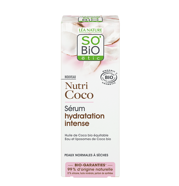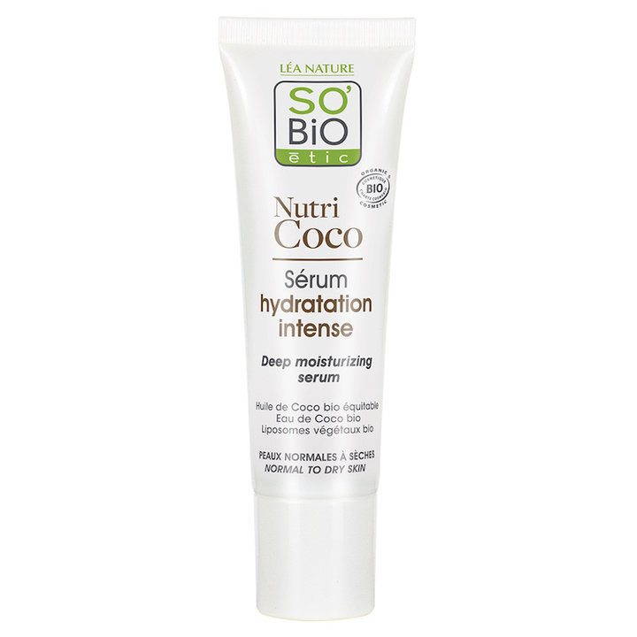 Het Nutri Coco Deep Moisturizing Serum van SO'BiO étic is een intensief hydraterend serum voor de normale tot droge huid. Dit serum met het gepatenteerde Synergie[Coco]3®-complex combineert de rijkheid van olie met de frisheid van water in een lichte en fluweelzachte textuur. Het dringt direct in de huid voor een betere werking. Het hydrateert intensief en revitaliseert de huid met voedingsstoffen. Voor een stralende teint de hele dag door. Het Synergie[Coco]3®-complex combineert biologisch kokoswater en fair trade biologische kokosolie met biologische kokosliposomen. Bevat verder o.a. kamillewater, shea butter en vitamine E. Het Nutri Coco Deep Moisturizing Serum is niet comedogeen.