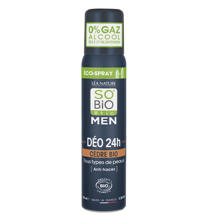 De MEN 24h Deo Eco-Spray Cedar van So'BiO étic is een natuurlijke deodorantspray voor mannen. Deze deodorantspray is vrij van drijfgassen, aluminiumzouten en alcohol. Beschermt je 24 uur lang effectief voor onaangename geuren, terwijl het de huid verzorgt. Met biologische aloë vera en biologische etherische cederolie. De deodorant heeft een houtachtige geur.
